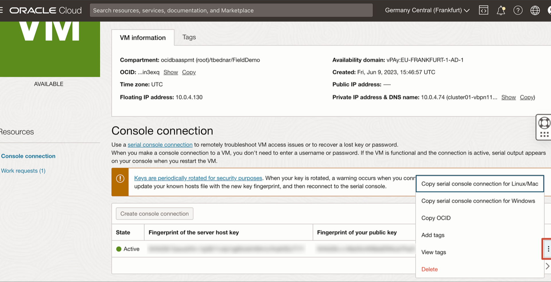 Oracle Exadata Database Service on Dedicated Infrastructure에서 가상 머신에 대한 직렬 콘솔 접속을 생성합니다.