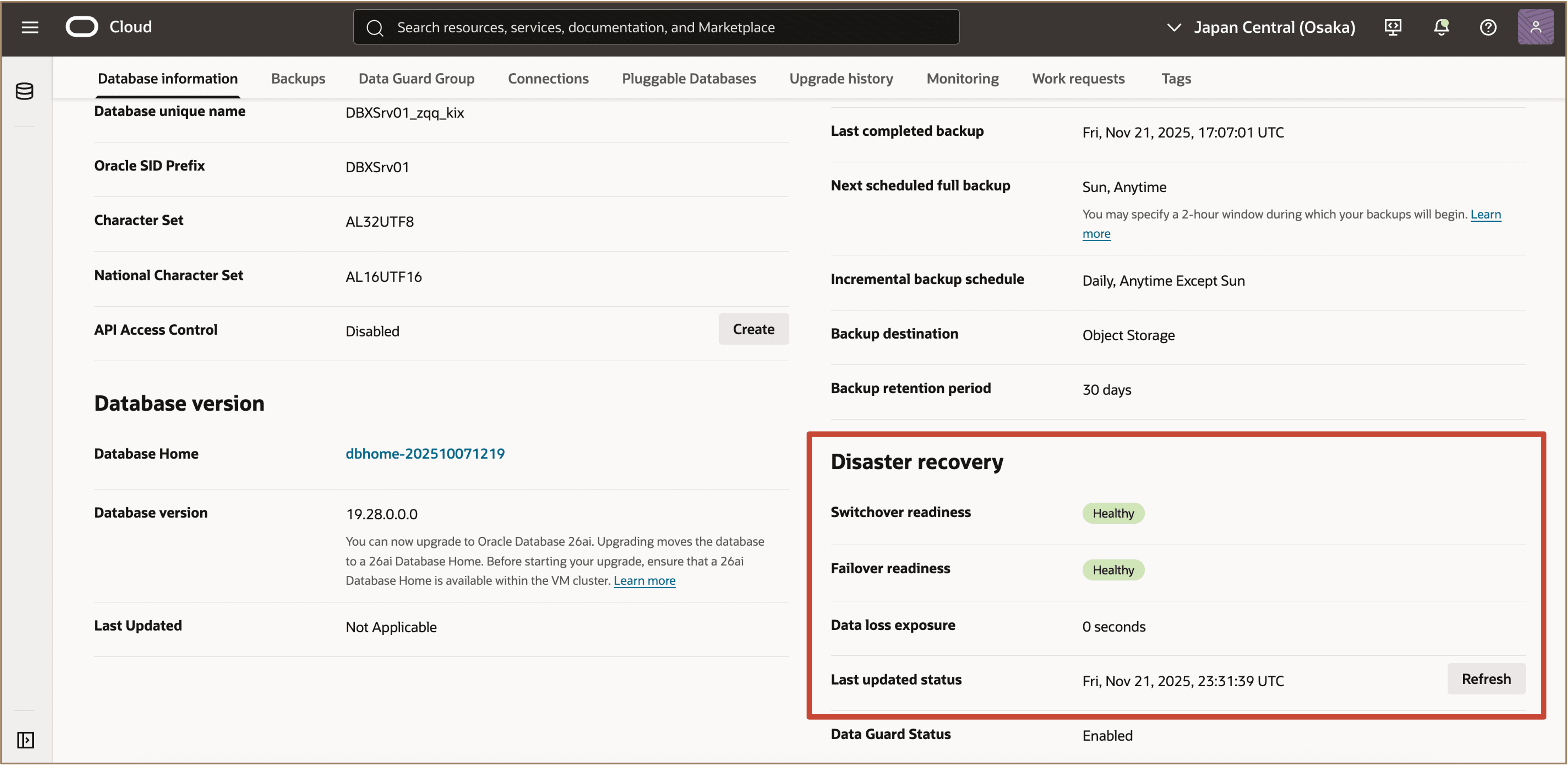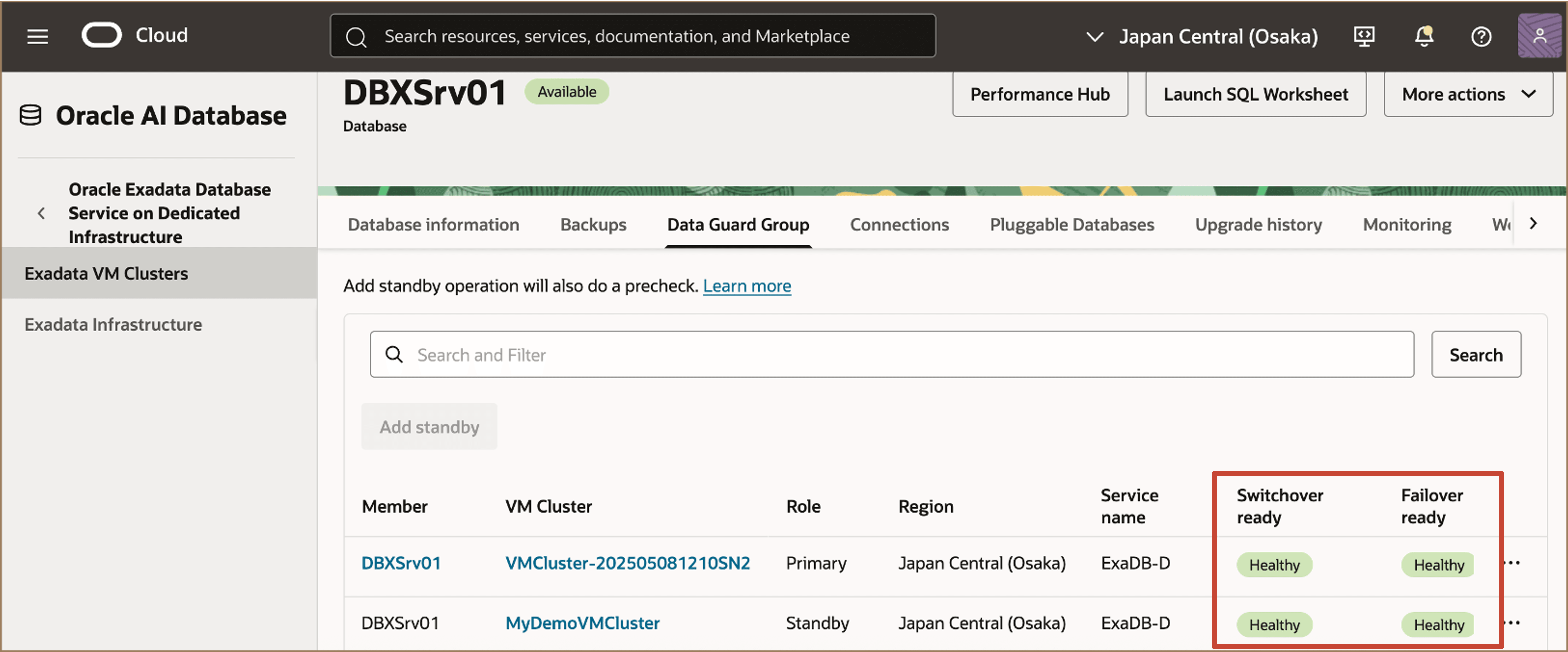 데이터베이스 세부정보 페이지에서 Data Guard 그룹 탭으로 이동합니다. Data Guard Group(데이터 보호 그룹) 탭에서 Switchover ready(전환 준비 완료) 및 Failover ready(페일오버 준비) 상태를 확인합니다.