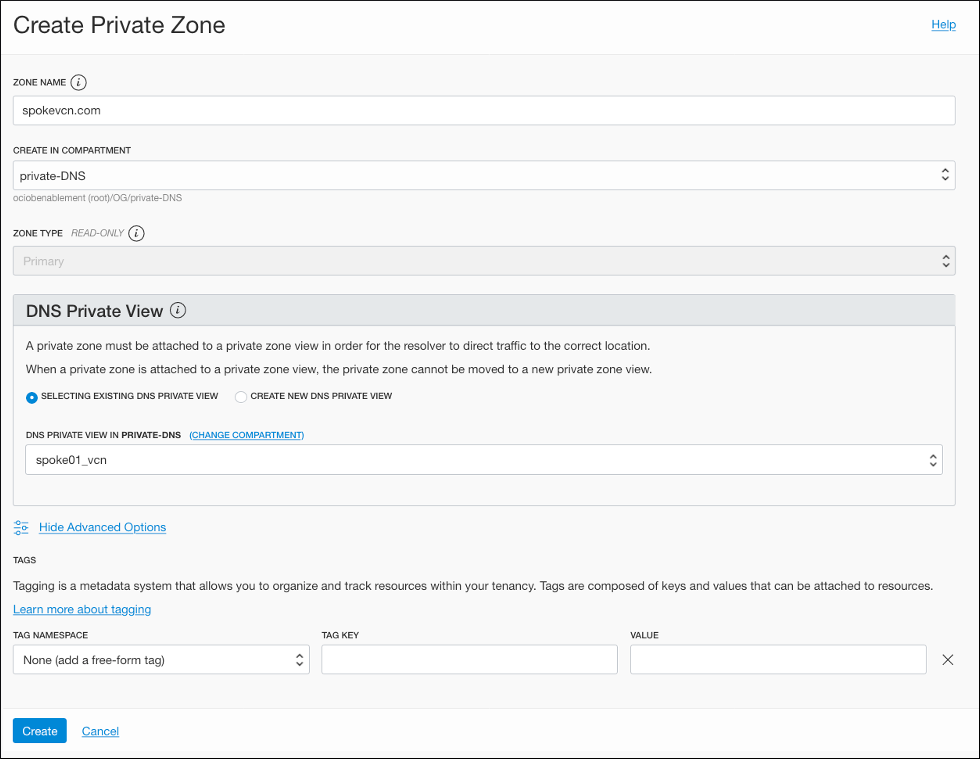 Hub VCN에 spokezone.com 사용자정의 전용 영역 생성