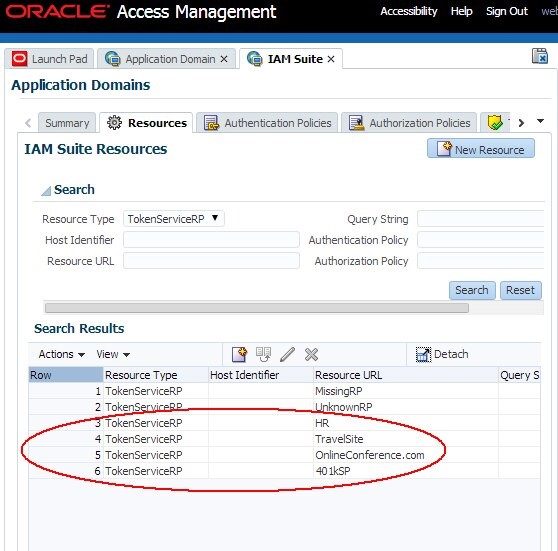 TokenServiceRP를 선택합니다. 검색을 누릅니다.TokenServiceRP유형의 리소스 목록이 표시됩니다.MissingRP및UnknownRP는 OSTS 권한 부여 정책과 관련이 있습니다.HR,TravelSite,OnlineConference.com및401kSP가 표시됩니다.