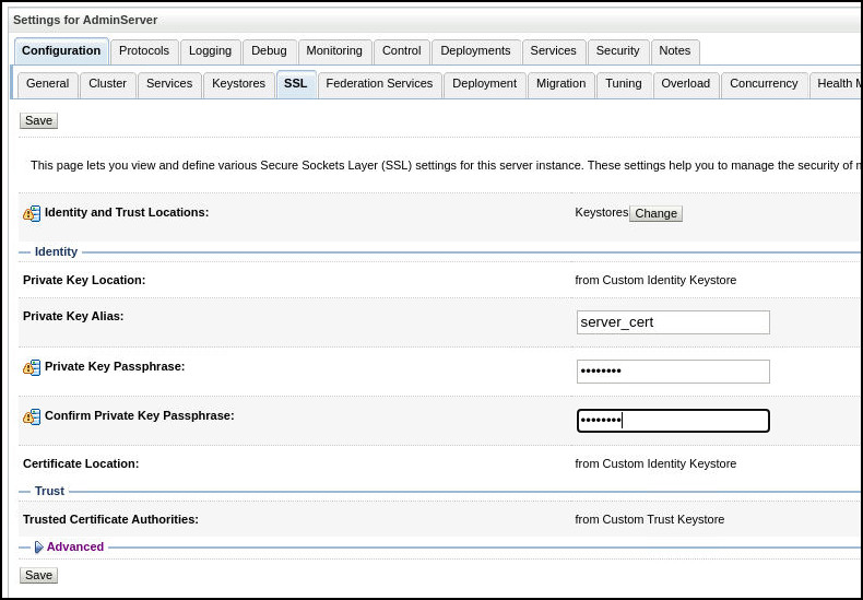 Keystores 드롭다운 목록에서 Custom Identity and Custom Trust를 선택합니다. Save를 누릅니다.