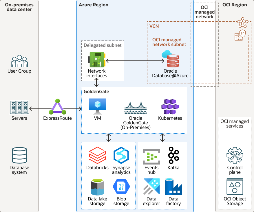 Oracle GoldenGate는 가장 인기 있는 실시간 데이터 패브릭 도구 중 하나이며 이미 Azure와의 통합이 많습니다(예: Azure SQL, Azure Database for PostgreSQL, Azure Data Lake Storage, Azure Cosmos DB, Azure Synapse Analytics, Azure Event Hub, Azure의 Databricks, Azure Site Recovery 및 Azure의 Snowflake). Oracle Database@Azure와 Oracle GoldenGate를 함께 사용하는 고객은 실시간으로 이러한 데이터 저장소 안팎으로 데이터를 이동할 수 있습니다. 다른 인프라(예: OCI, 온프레미스 또는 기타 클라우드)의 Oracle 데이터베이스 간에 실시간 트랜잭션이 필요한 Oracle Database@Azure 고객은 Oracle GoldenGate를 사용할 수도 있습니다.