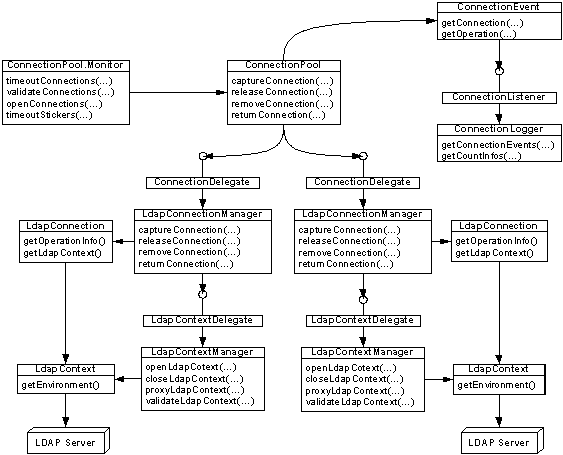 // Specify the environment for the first LDAP context manager. Map environment1 = new HashMap(); environment1.put(LdapContext.INITIAL_CONTEXT_FACTORY, "com.sun.jndi.ldap.LdapCtxFactory"); environment1.put(LdapContext.PROVIDER_URL, "ldap://<host1>:<port1>"); // Specify the environment for the second LDAP context manager. Map environment2 = new HashMap(); environment2.put(LdapContext.INITIAL_CONTEXT_FACTORY, "com.sun.jndi.ldap.LdapCtxFactory"); environment2.put(LdapContext.PROVIDER_URL, "ldap://<host2>:<port2>"); // Create an array of connection delegates for the connection pool. ConnectionDelegate[] delegates = new ConnectionDelegate[] { new LdapConnectionManager(new LdapContextManager(environment1, null)), new LdapConnectionManager(new LdapContextManager(environment2, null)), new SqlConnectionManager(...), new SqlConnectionManager(...) }; // Create the connection pool with initial size of 100. ConnectionPool pool = new ConnectionPool(delegates, 100); // Create the connection logger. ConnectionLogger logger = new ConnectionLogger("ConnectionLogger.xml"); // Add the connection logger as a connection listener to the pool. pool.addConnectionListener(logger); // Schedule the monitor for the pool. pool.getMonitor().schedule(); // Specify the desired parameters for the connection to be captured from the pool. Map parameters = new HashMap(); parameters.put(Connection.Parameter.TYPE, LdapConnection.TYPE); parameters.put(Connection.Parameter.PRINCIPAL, "..."); parameters.put(Connection.Parameter.CREDENTIALS, "..."); // Capture an LDAP connection from the pool. LdapConnection connection = (LdapConnection)pool.captureConnection(parameters); // Get LDAP context from the captured connection. LdapContext context = connection.getLdapContext(); // Use the LDAP context as desired, but do not alter its environment ever! // If you need an LDAP context with a different environment, capture another // connection from the pool and specify the desired connection parameters. // If the LDAP context environment is altered, pool will reject the connection. // When finished using the connection, release the connection into the pool. pool.releaseConnection(connection, null);