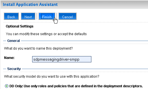 Enter an application name in the Application Attributes screen. The application name must exactly match the string used for DriverDeploymentName (in Step 3 above) which is provided in the Deployment Plan. If it does not, the deployment and activation will fail. The Deployment Setting screen appears.