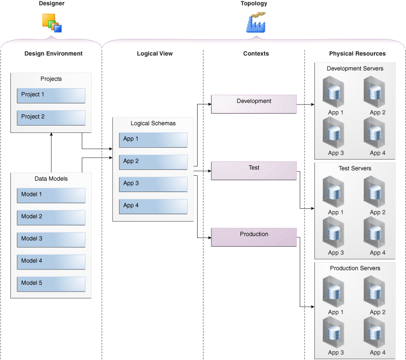 Integration projects exist in different environments during their lifecycle (development, test, production) and may even run in different environments in production (multiple site deployment). Oracle Data Integrator makes easier the definition and maintenance of these environments, as well as the lifecycle of the project across these environments using the Topology.