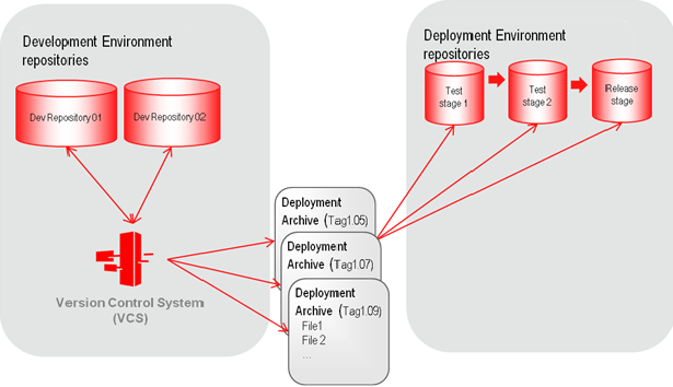The repositories in the development environment are connected to the version control system. These repositories are used to actively develop the ODI objects. Once the ODI objects are ready for testing or production, the deployment archives are created with them. These deployment archives are applied to a test repository for verification and upon successful testing are promoted to the production repositories.