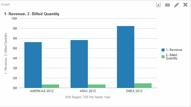 다음 그림은 두 개의 측정항목 1 - Revenue와 2 - Billed Quantity로 구성된 세로 막대 그래프를 정렬한 결과를 보여줍니다. 이 측정항목은 T05 Per Name Year로 그룹화되고, D50 Region으로 프롬프트되고, 1 - Revenue를 기준으로 오름차순으로 정렬되어 있습니다.