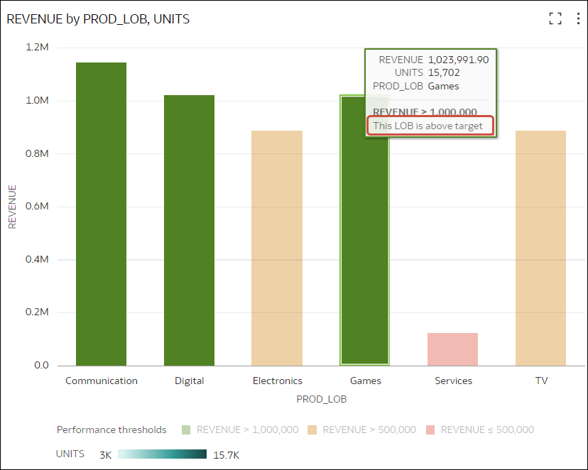 Mit der bedingten Formatierung können Business-Anwender Ereignisse oder Änderungen in ihren Daten erkennen. Beispiel: Wenn Benutzer sehen möchten, wenn Umsätze hohe, mittlere oder niedrige Schwellenwerte erreichen, können Sie eine Regel für die bedingte Formatierung erstellen, um die Umsatzdatenpunkte grün, orange oder rot zu färben.