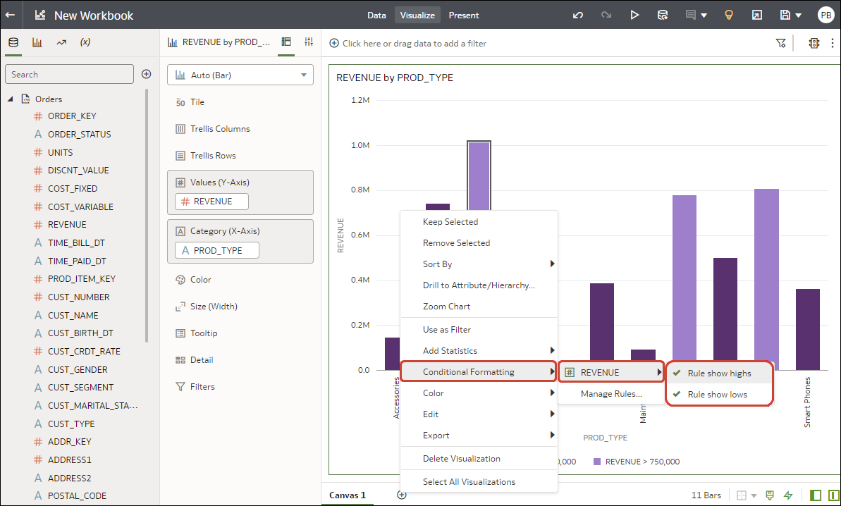 - Zeigen Sie im Visualisierungseditor mit der Maus auf eine Visualisierung, führen Sie einen Rechtsklick aus, und wählen Sie Bedingte Formatierung aus, um Kennzahlen mit verfügbaren Regeln anzuzeigen.