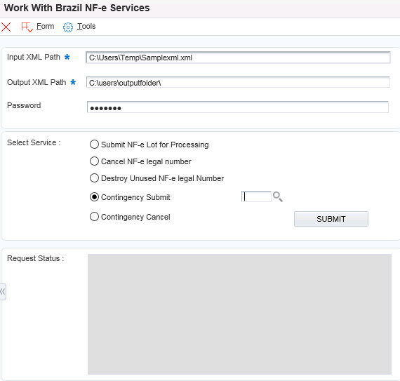 Informe o caminho para o arquivo XML que você deseja submeter para processamento. Observe que o sistema também grava o arquivo XML intermediário (requestNfeRet Recepcao xxxxxxxxxxxxx.xml) nesta localização, se a submissão ao Web service NfeRetRecepcao não for finalizada com sucesso.