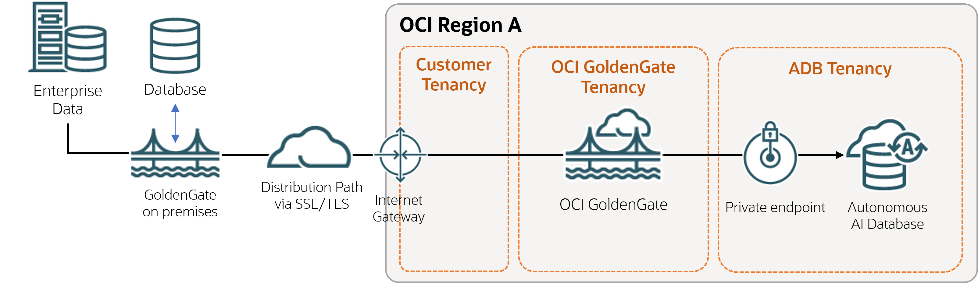 O Oracle Cloud Infrastructure GoldenGate permite enviar dados de um Oracle GoldenGate local ou Marketplace para o OCI GoldenGate usando um Distribution Path. As etapas a seguir orientam você a configurar e executar esse modelo de replicação usando a versão mais recente do Oracle GoldenGate para o OCI Marketplace.
