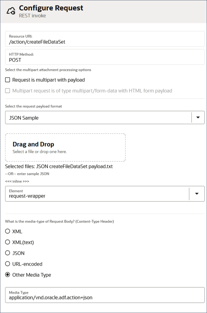 - Especifique o ponto final como /action/createFileDataSet e defina a ação como POST.