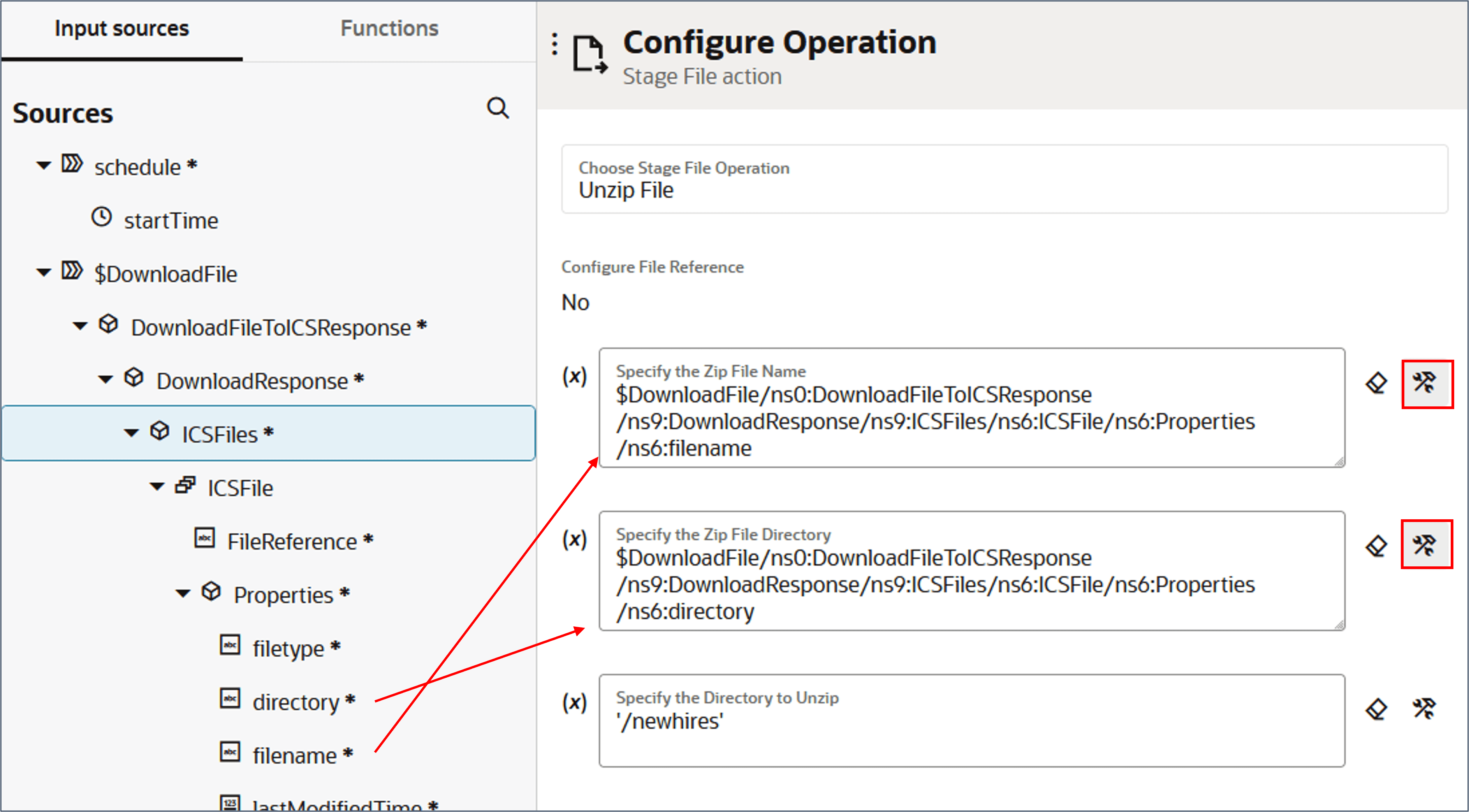 - Expanda totalmente a hierarquia de origem $DownloadFile. Arraste o atributo de origem nome do arquivo para o campo Nome do Arquivo zip e o atributo de origem diretório para o campo Diretório do Arquivo zip.