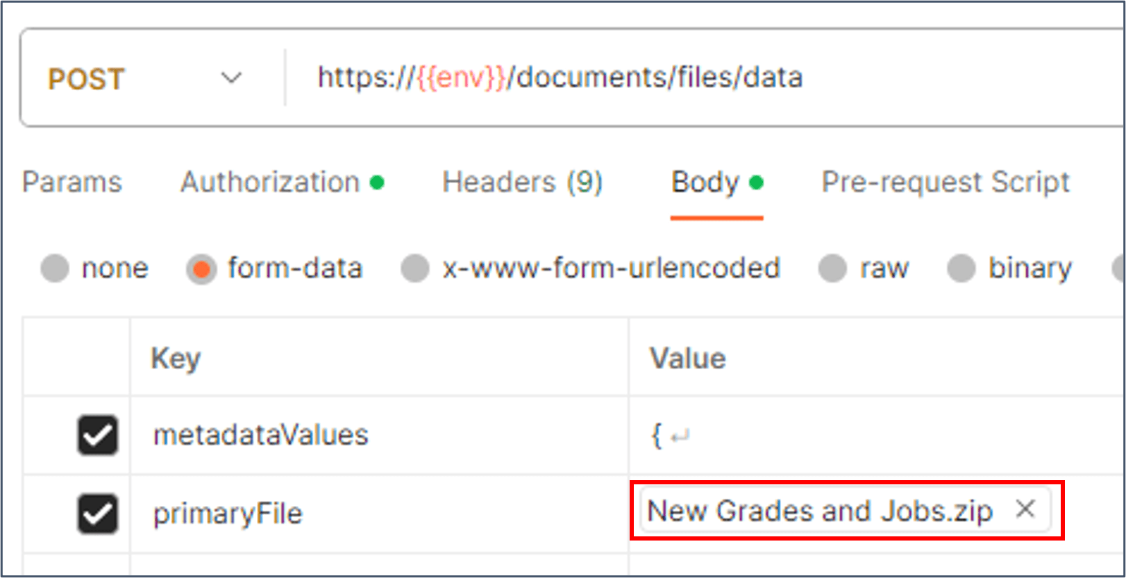 - Nos dados de form do Corpo da solicitação, clique em Selecionar Arquivos