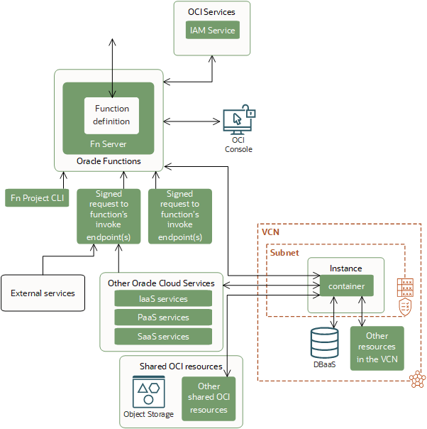 Quando a função está sendo executada dentro do contêiner, a função pode ler e gravar outros recursos e serviços em execução na mesma sub-rede (por exemplo, Database as a Service). A função também pode ler e gravar para outros recursos compartilhados (por exemplo, Object Storage) e outros Oracle Cloud Services. Você pode especificar o tempo máximo que a função pode executar definindo um timeout no arquivo func.yaml ou na Console.