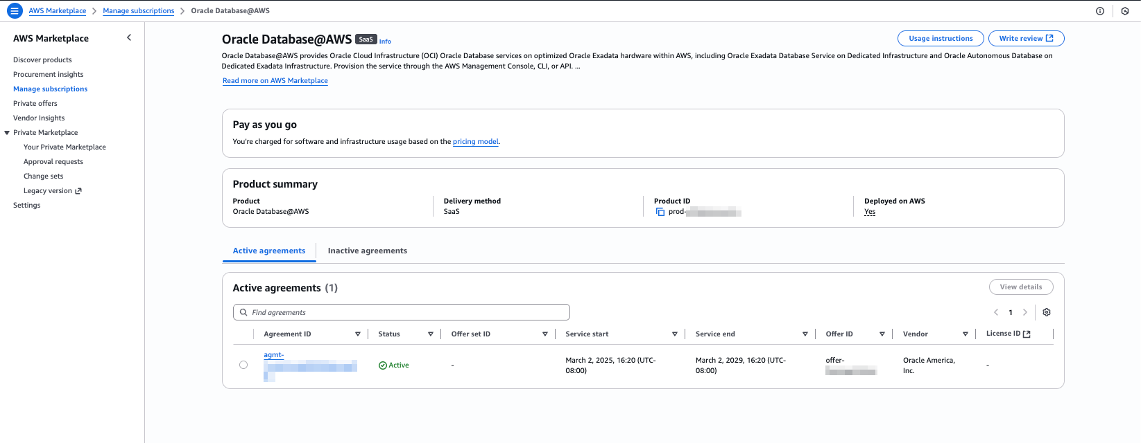 Uma oferta privada aceita cria uma assinatura do Oracle AI Database@AWS em sua conta de comprador.