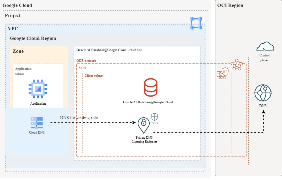 Para oferecer suporte à resolução de nomes de domínio, o Oracle AI Database@Google Cloud utiliza o encaminhamento de DNS na nuvem, permitindo que as cargas de trabalho do Google Cloud resolvam nomes de domínio totalmente qualificados (FQDNs) de bancos de dados hospedados em sub-redes privadas da OCI.