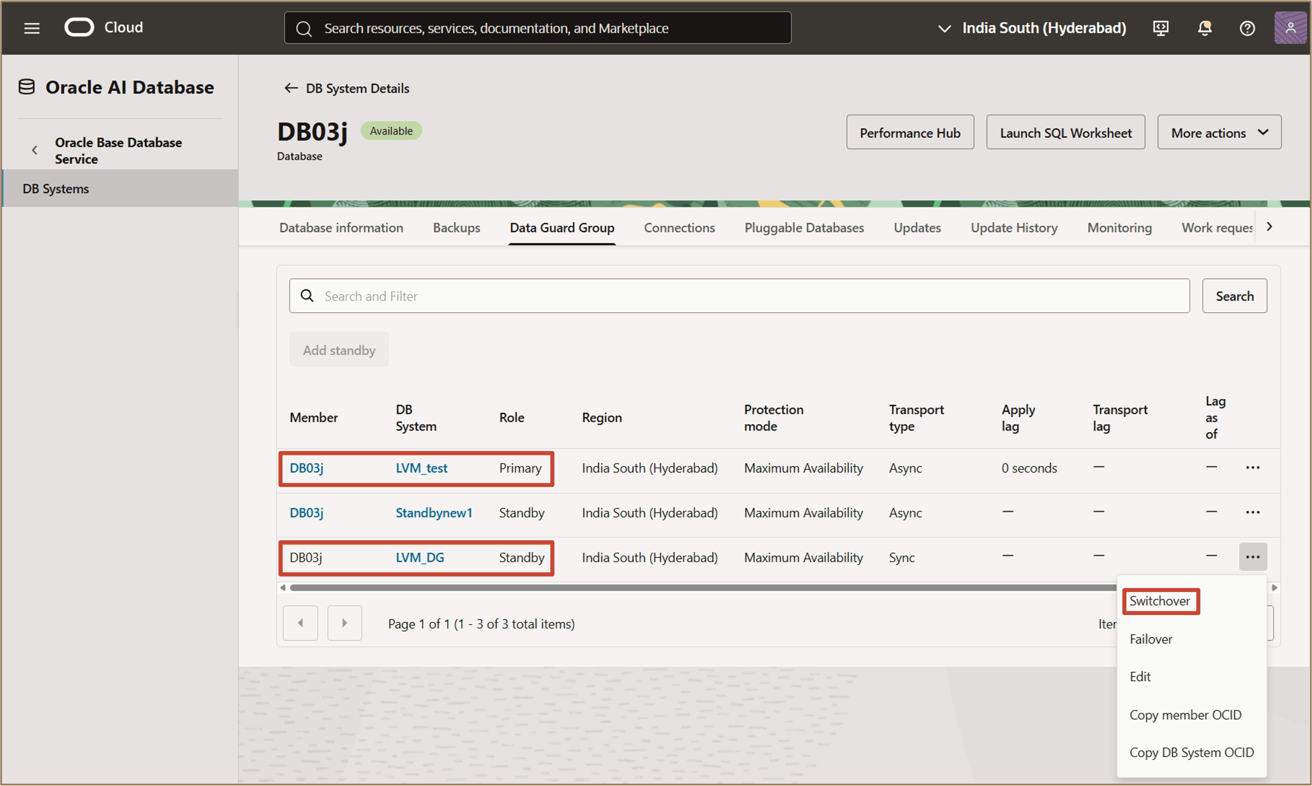 Clique no menu ações (três pontos) do banco de dados stand-by selecionado e clique em Switchover.