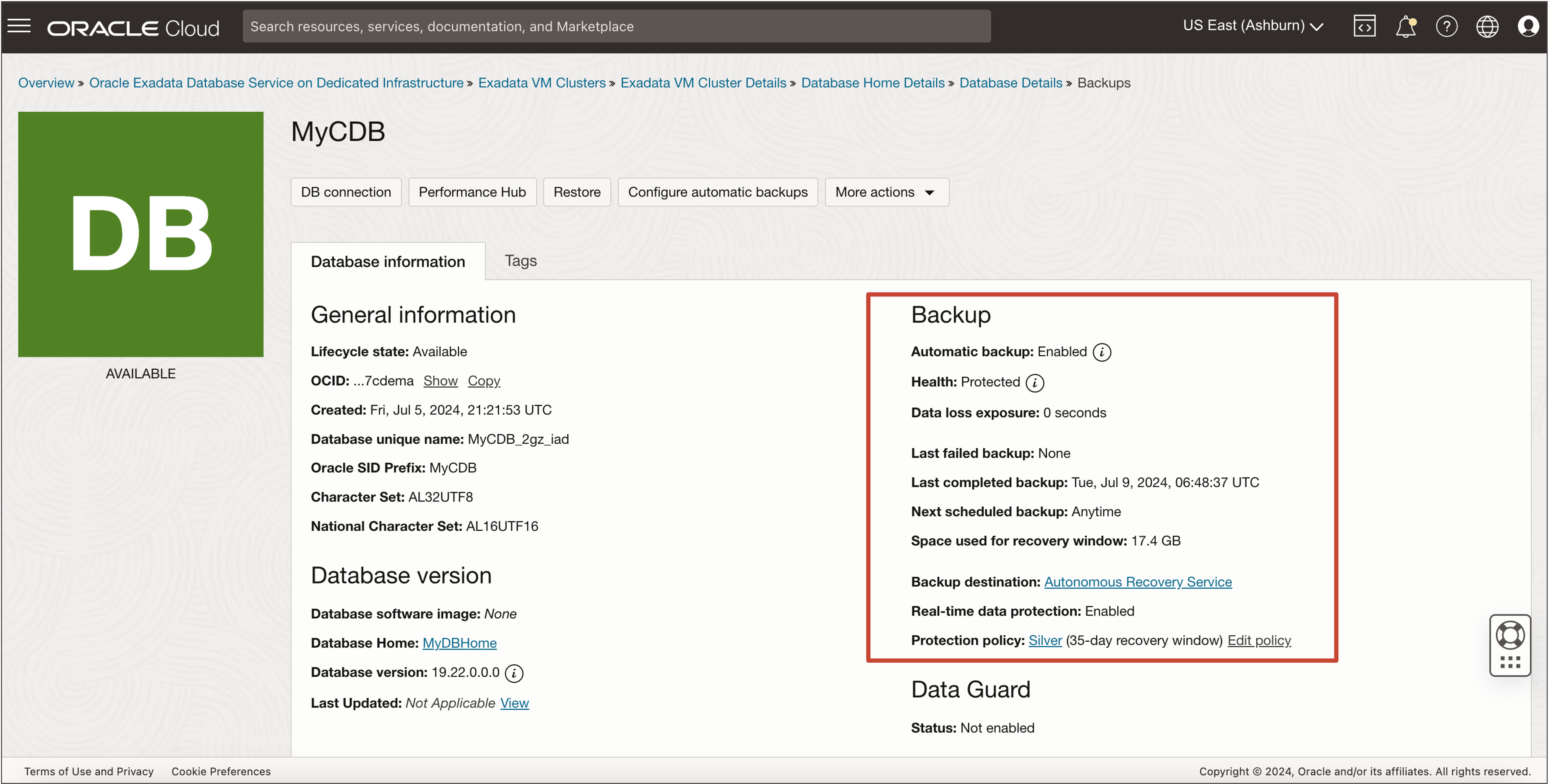Na página Detalhes do banco de dados, exiba os detalhes do backup na seção Backup.