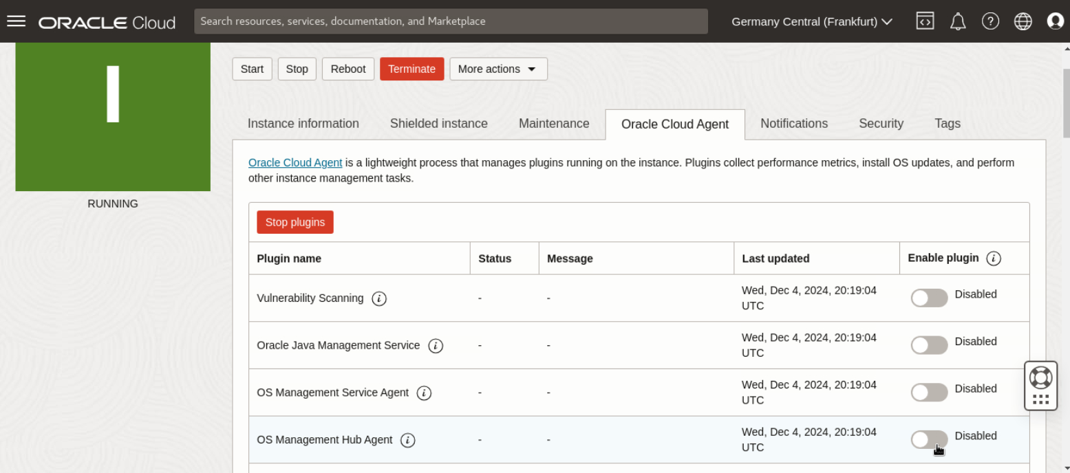 Para registrar instâncias de computação existentes, você deve ativar o plug-in do OS Management Hub, e um perfil de registro deve ser definido na página de detalhes da instância.