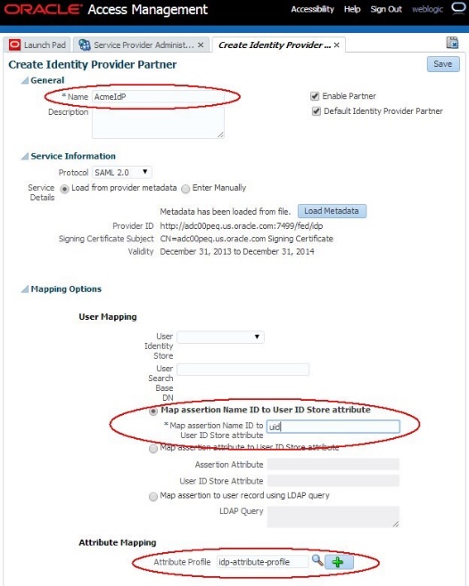 Esta seção mostra como configurar o OAM/SP para processar atributos SAML 2.0 de entrada por meio da console de administração. O exemplo é baseado em uma Federação com um parceiro IdP SAML 2.0 remoto identificado como AcmeIdP no OAM/SP: