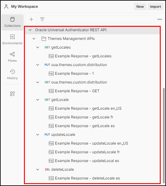 Na guia Coleções, navegue até API REST do Oracle Universal Authenticator > APIs de Gerenciamento de Temas