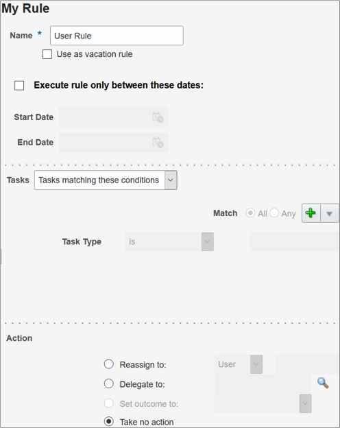 - 不执行操作:仅在创建例外规则时使用此选项。例如,假设您具有一个可重新分配所有费用报表审批的规则。但是,您希望自己审批特定员工的费用,因为您过去对他们的费用有疑问。您可以创建以该员工为条件的例外规则,然后选择不执行操作。该员工的费用报表仍将分配给您。