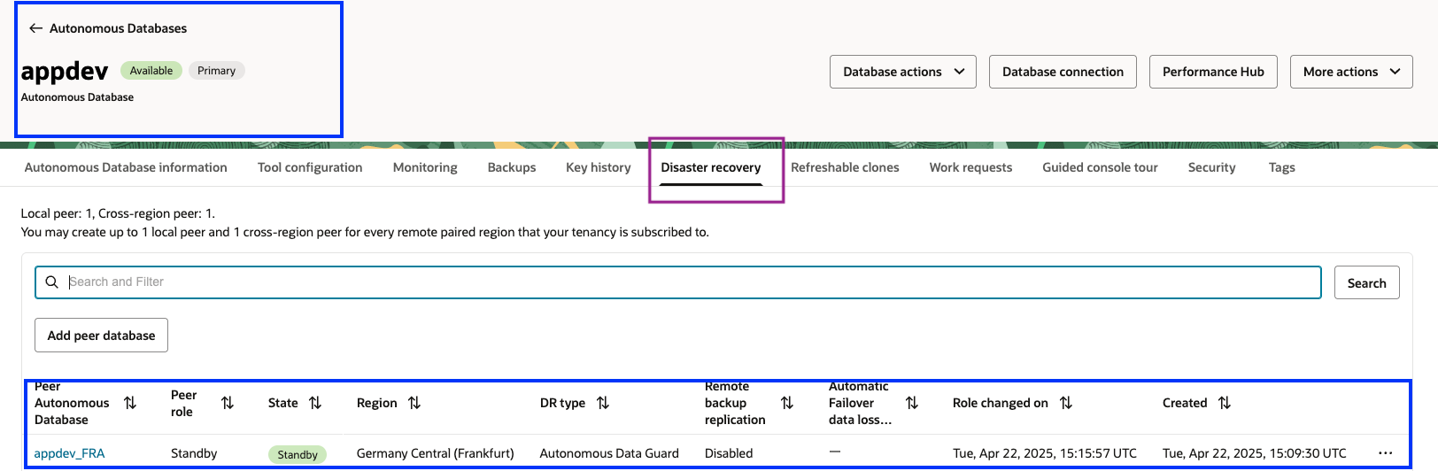 在主区域中创建 Autonomous Database Serverless,在 DR 区域设置跨区域 Oracle Autonomous Data Guard:有关更多信息,请参见: