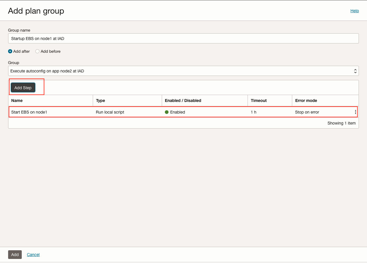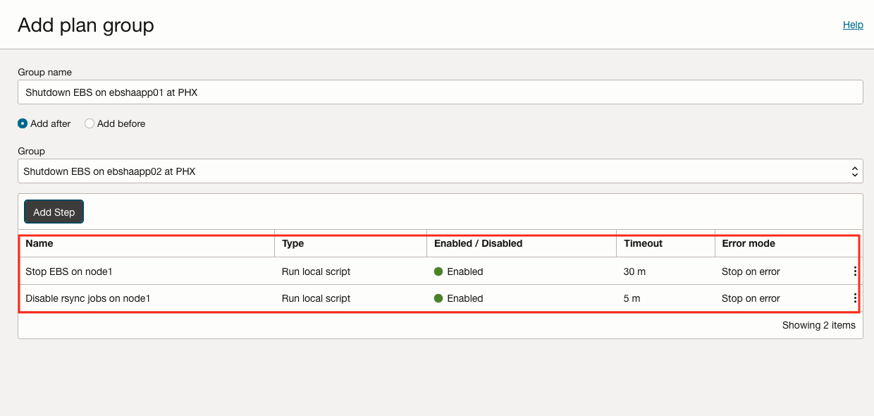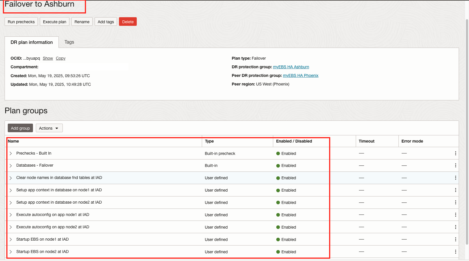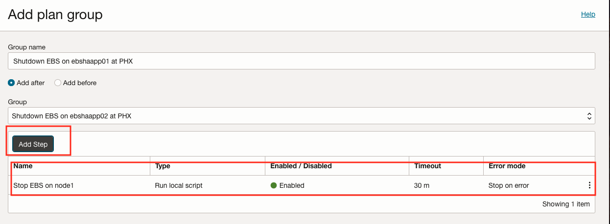 按照与任务 6 相同的流程,在区域 1 中自定义 DR 计划。通过添加用户定义的计划组来确保。为生产和 DR 区域选择合适的 Oracle E-Business Suite 应用 VM 以执行脚本非常重要。