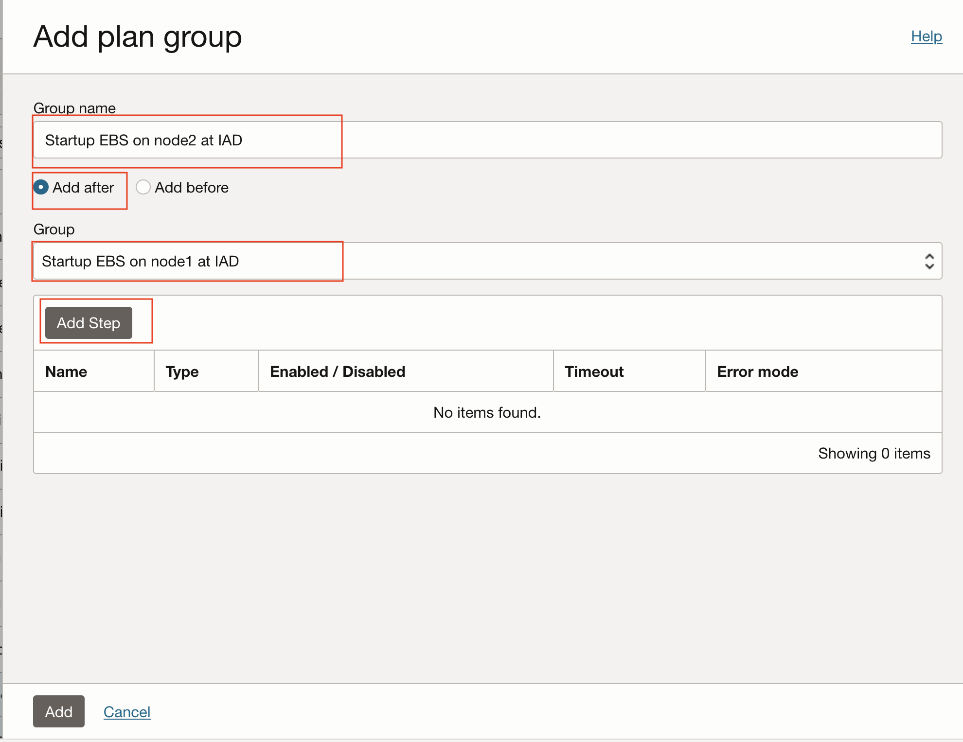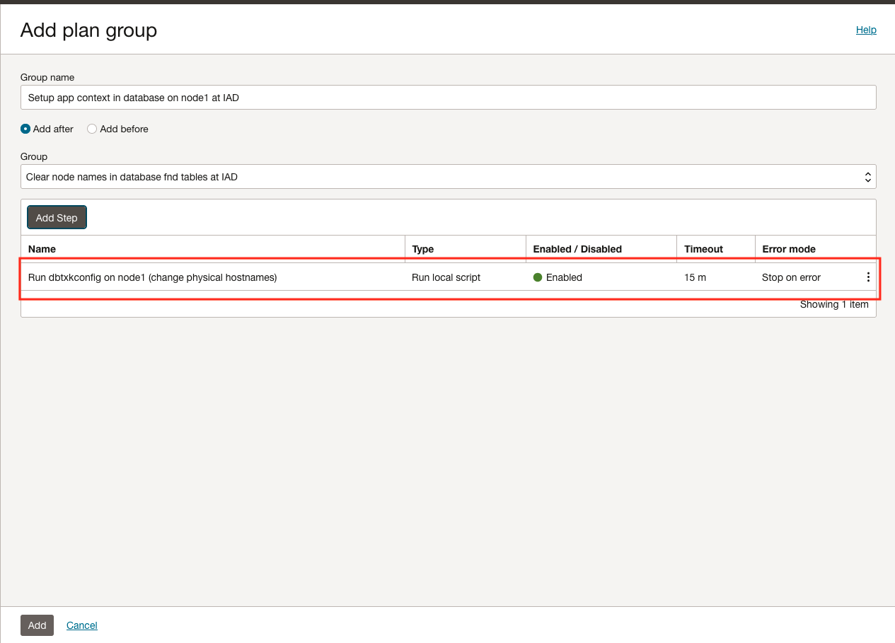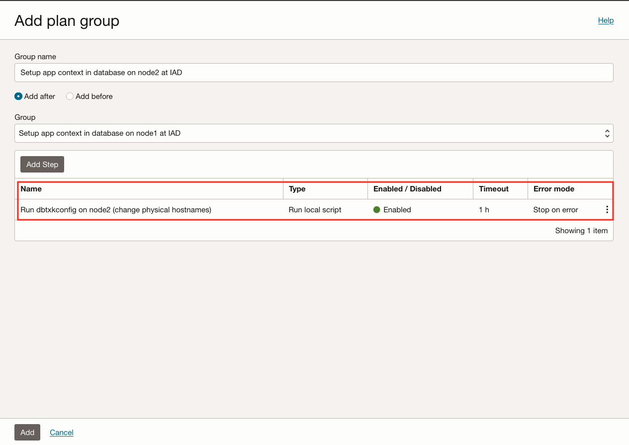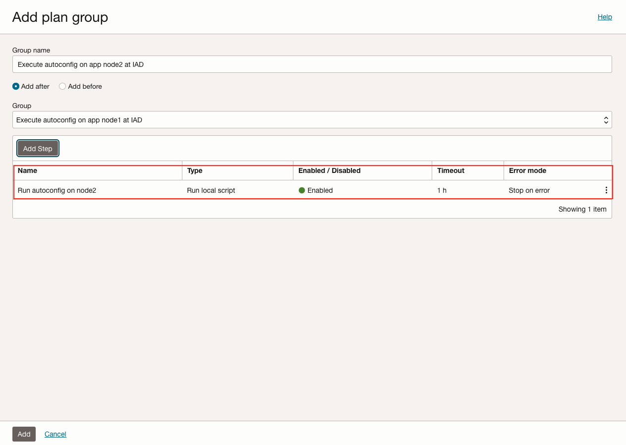 按照与任务 6 相同的流程,在区域 1 中自定义 DR 计划。通过添加用户定义的计划组来确保。为生产和 DR 区域选择合适的 Oracle E-Business Suite 应用 VM 以执行脚本非常重要。