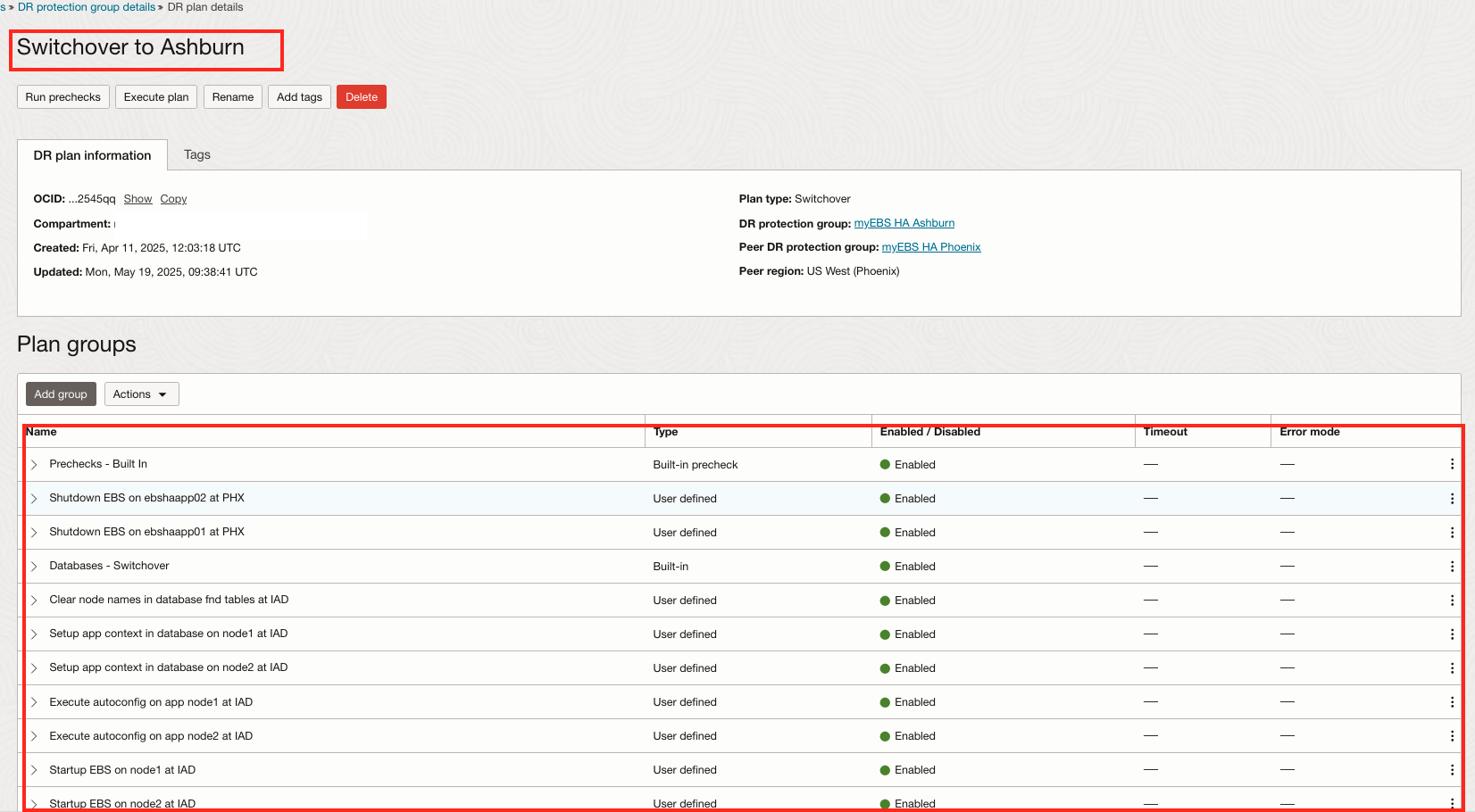 恢复团队需要执行最终验证,以演示 OCI Full Stack DR 保护组和生产工作负载计划的准备情况。区域 2(阿什本)应是此过程中的主要区域。通过完成以下步骤开始最终验证所有计划: