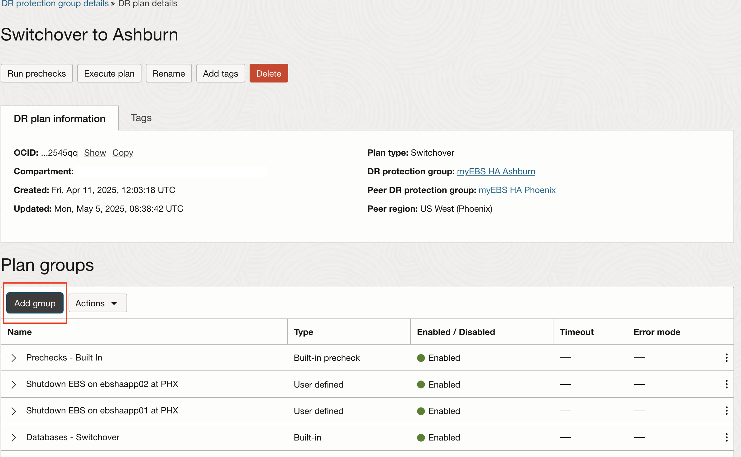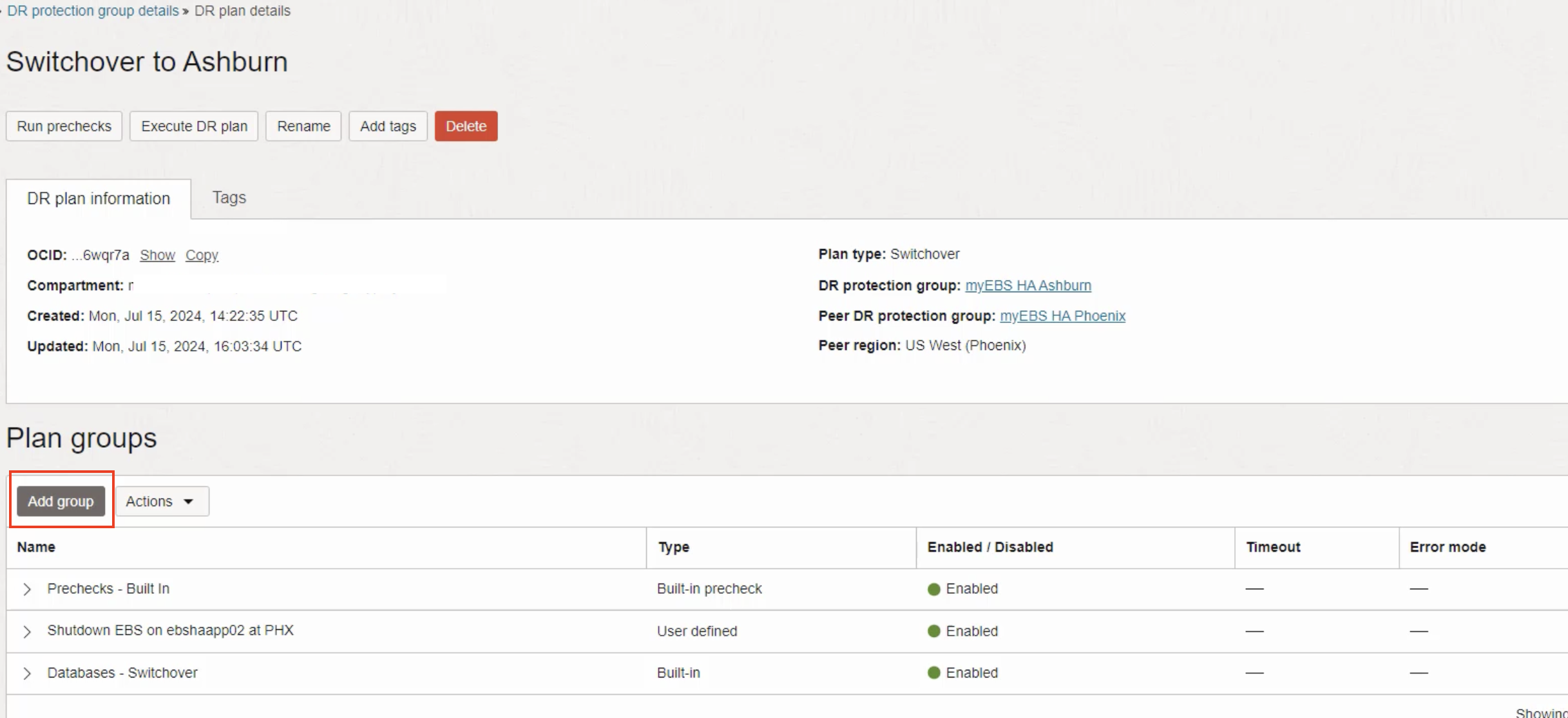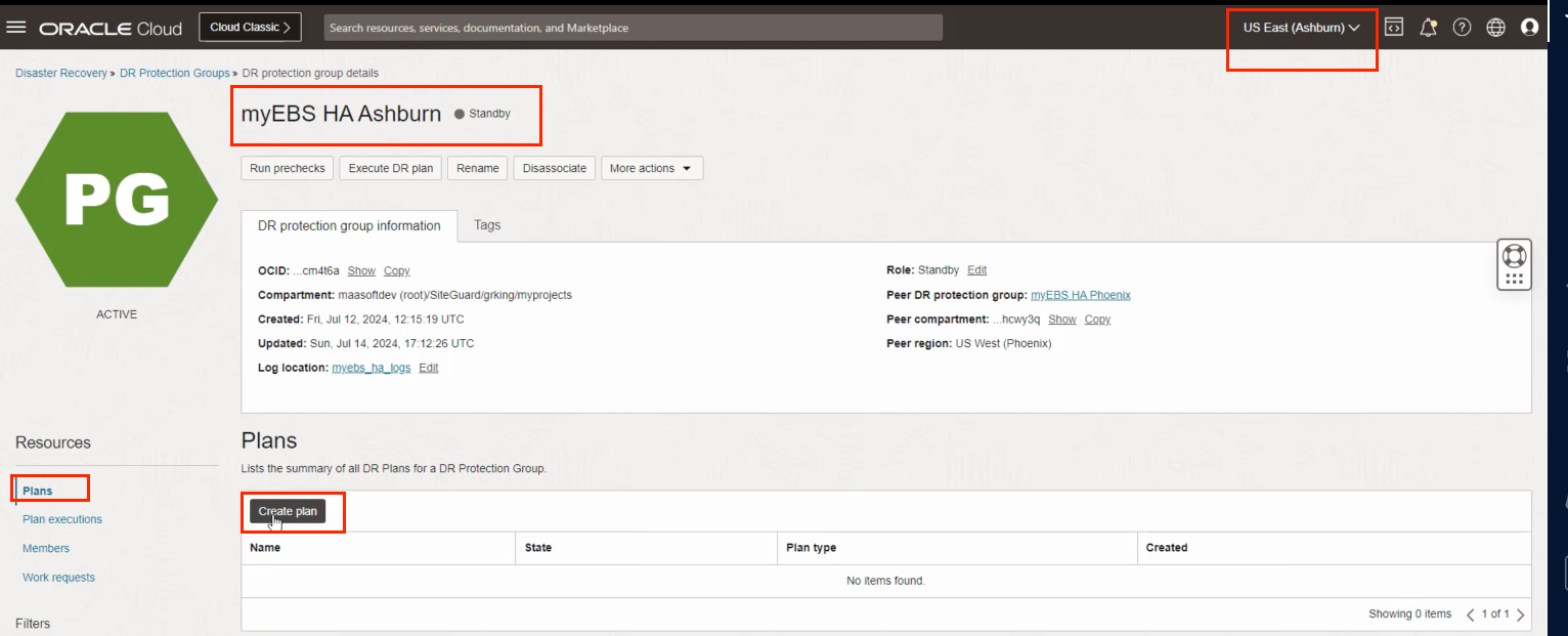 任务 5:在区域 2 (Ashburn) 中创建 DR 计划。