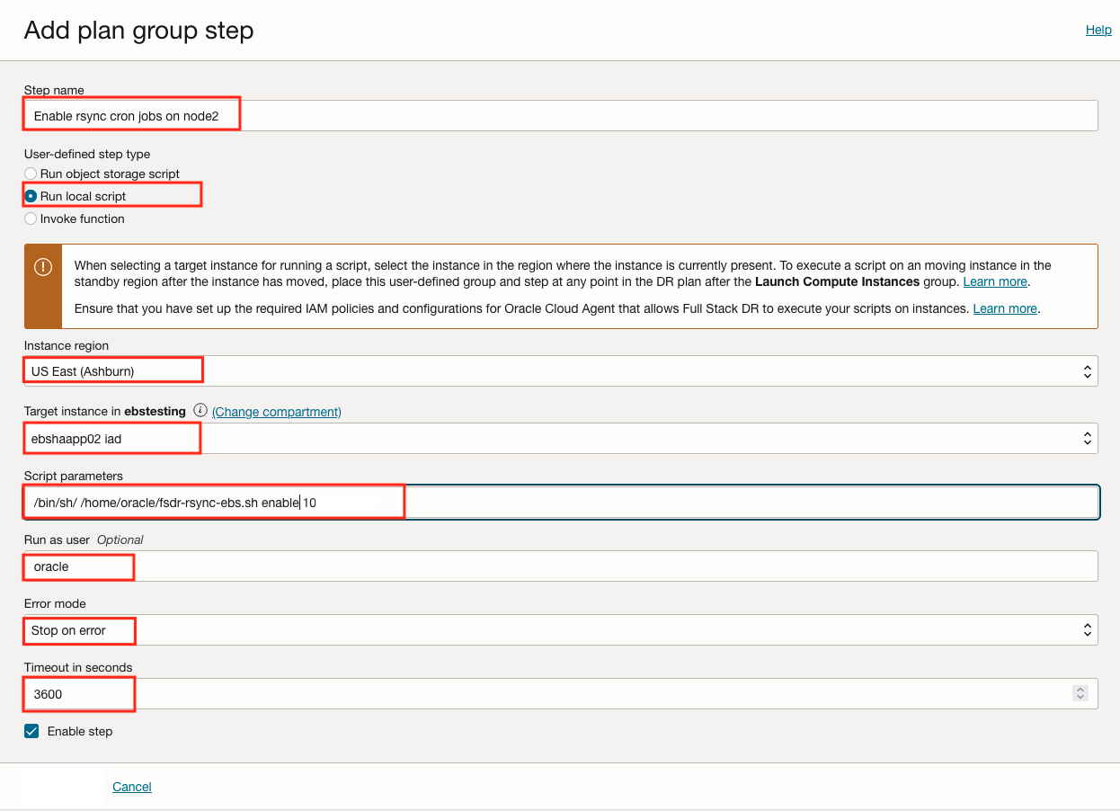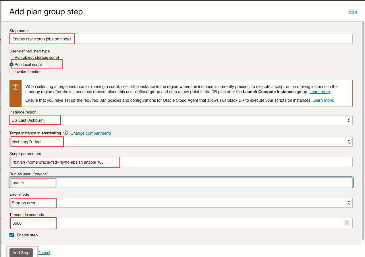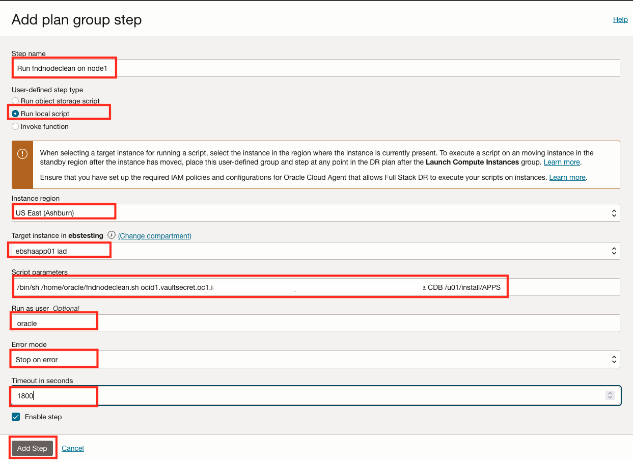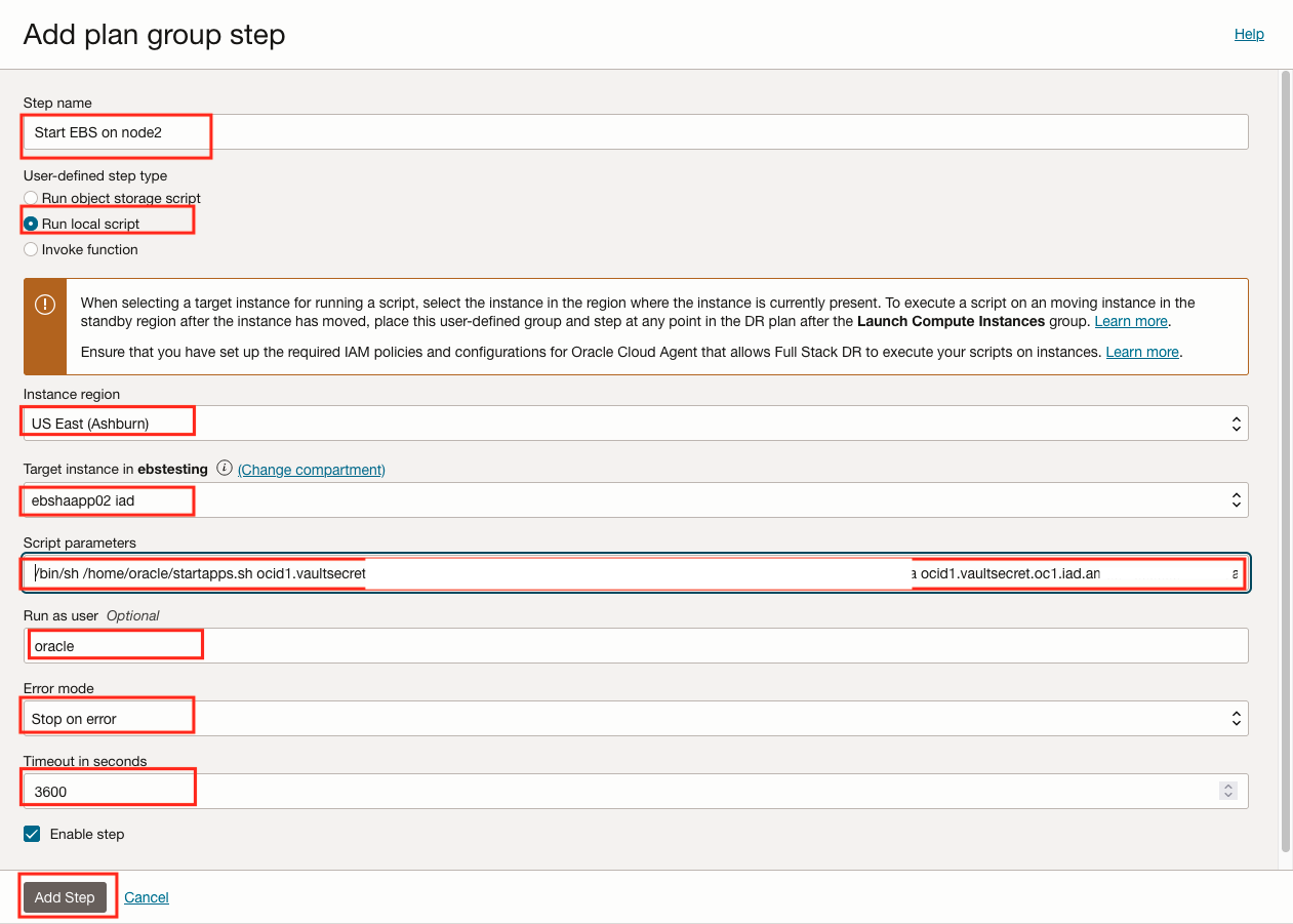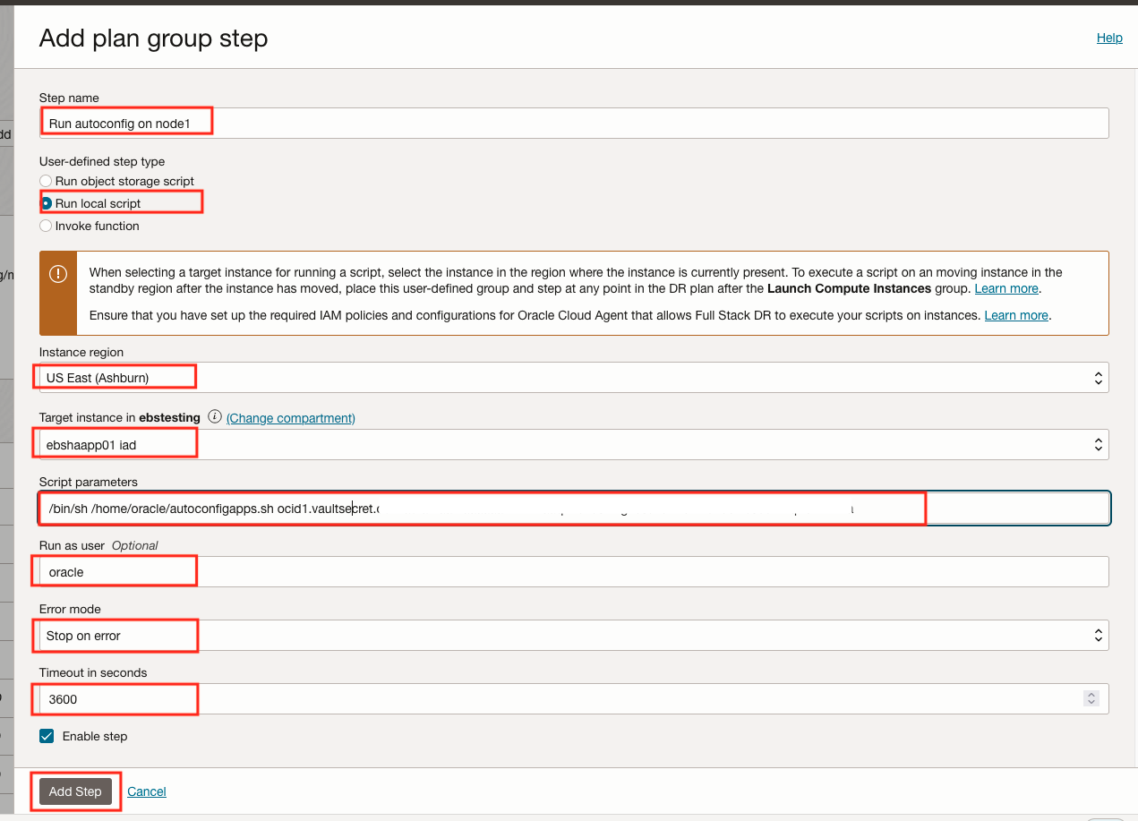 Oracle E-Business Suite 的恢复解决方案要求 OCI Full Stack DR 在恢复操作(例如故障转移、切换或钻取)期间执行一系列定制 bash 脚本。在本教程中,我们将使用 Oracle E-Business Suite 应用程序节点作为托管和运行脚本的控制节点。
