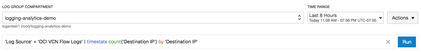 'Log Source' = 'OCI VCN Flow Logs’ | stats count('Destination IP') by 'Destination IP'