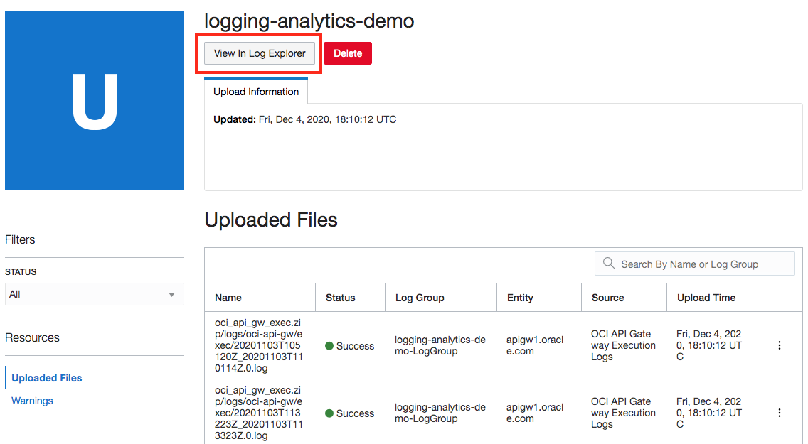 通过导航到 Logging Analytics 验证上载,然后单击 Administration(管理)。在资源下,单击上载。单击