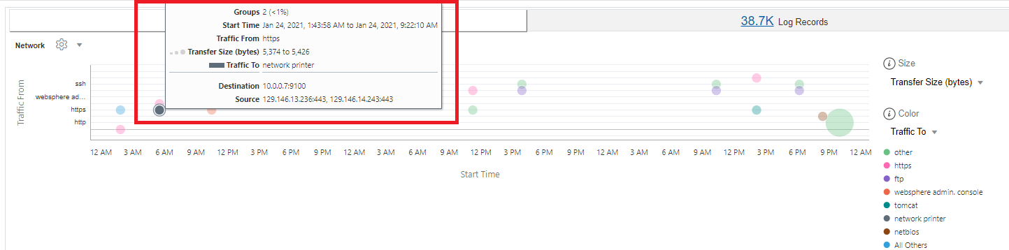 'Upload Name' = 'logging-analytics-demo' and 'Log Source' = 'OCI VCN Flow Logs' | eval 'Source Name' = if('Source Port' = 80, HTTP, 'Source Port' = 443, HTTPS, 'Source Port' = 21, FTP, 'Source Port' = 22, SSH, 'Source Port' = 137, NetBIOS, 'Source Port' = 648, RRP, 'Source Port' = 9006, Tomcat, 'Source Port' = 9042, Cassandra, 'Source Port' = 9060, 'Websphere Admin. Console', 'Source Port' = 9100, 'Network Printer', 'Source Port' = 9200, 'Elastic Search', Other) | eval 'Destination Name' = if('Destination Port' = 80, HTTP, 'Destination Port' = 443, HTTPS, 'Destination Port' = 21, SSH, 'Destination Port' = 22, FTP, 'Destination Port' = 137, NetBIOS, 'Destination Port' = 648, RRP, 'Destination Port' = 9006, Tomcat, 'Destination Port' = 9042, Cassandra, 'Destination Port' = 9060, 'Websphere Admin. Console', 'Destination Port' = 9100, 'Network Printer', 'Destination Port' = 9200, 'Elastic Search', Other) | eval Source = 'Source IP' || ':' || 'Source Port' | eval Destination = 'Destination IP' || ':' || 'Destination Port' | link Source, Destination | stats avg('Content Size Out') as 'Transfer Size (bytes)', unique('Source Name') as 'Traffic From', unique('Destination Name') as 'Traffic To' | classify topcount = 300 correlate = -*, Source, Destination 'Start Time', 'Traffic From', 'Transfer Size (bytes)', 'Traffic To' as Networkeval 功能将端口名称转换为应用程序。