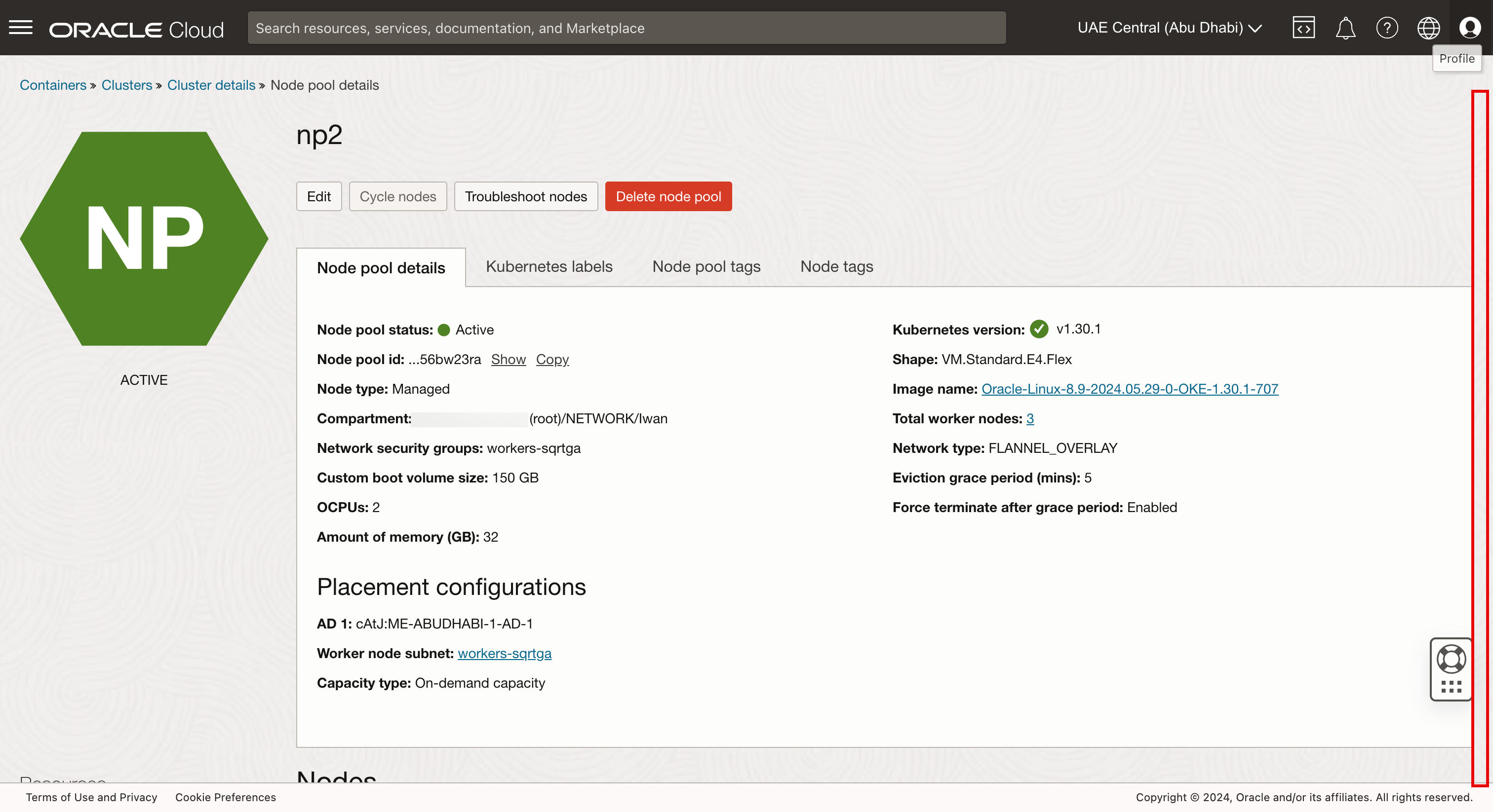 apiserver_private_host = "10.0.0.22" availability_domains = tomap({ "1" = "cAtJ:ME-ABUDHABI-1-AD-1" }) bastion_id = "ocid1.instance.oc1.me-abudhabi-1.anqxkljrpkxxxxxx5chephxjadkxqa2ekxksb5gokj4q" bastion_nsg_id = "ocid1.networksecuritygroup.oc1.me-abudhabi-1.aaaaaxxxxxxxxxxxy5qm22odw7by37h77ki6cosoqd7pzwq" bastion_public_ip = "129.151.149.237" bastion_subnet_cidr = "10.0.0.0/29" bastion_subnet_id = "ocid1.subnet.oc1.me-abudhabi-1.aaaaaaaxxxxxxxxxxxxxxxxmyzp6f2czibfr6534evfkt7m2a" cluster_endpoints = tomap({ "kubernetes" = "" "private_endpoint" = "10.0.0.22:6443" "public_endpoint" = "" "vcn_hostname_endpoint" = "cbyedhyevbq.cp.oke.oraclevcn.com:6443" }) cluster_id = "ocid1.cluster.oc1.me-abudhabi-1.aaaaaaaxxxxxxxxxxxxx57gz5q26hmpzkbcbyedhyevbq" control_plane_nsg_id = "ocid1.networksecuritygroup.oc1.me-abudhabi-1.aaaaaaaavxvgoewcgxxxxxxxxxxxxx6psycdz6zz5gaf6re4kcxa" control_plane_subnet_cidr = "10.0.0.16/29" control_plane_subnet_id = "ocid1.subnet.oc1.me-abudhabi-1.aaaaaaaajvvpdmuixxxxxxxxxxxjkpx77hqu3v2s4qilnp56a" dynamic_group_ids = tolist([ "ocid1.dynamicgroup.oc1..aaaaaaaafsikvwgexxxxxxxxx5tx2u4c2s2eic4sslwyabva", ]) ig_route_table_id = "ocid1.routetable.oc1.me-abudhabi-1.aaaaaaaalxxxxxxxxxxxxxxcyzrl2af4ihrkhcjttu2w7aq" int_lb_nsg_id = "ocid1.networksecuritygroup.oc1.me-abudhabi-1.aaaaaaaanwppaafc7fyiwcoyhjxxxxxxxxxxxxxxxxx6a6752l7547gxg7ea" int_lb_subnet_cidr = "10.0.2.0/27" int_lb_subnet_id = "ocid1.subnet.oc1.me-abudhabi-1.aaaaaaaawo5xmcwwbzk3gxxxxxxxxxxxxxxxxxxjjfllbvsdauaq" lpg_all_attributes = {} nat_route_table_id = "ocid1.routetable.oc1.me-abudhabi-1.aaaaaaaapqn3uqtszdcxxxxxxxxxxxxxxxxxliwveow232xgffigq" operator_id = "ocid1.instance.oc1.me-abudhabi-1.anqxkljrpkbrwsac5exxxxxxxxxxxxxxxxxxxxxxxrfdxsjdfzmq56jja" operator_nsg_id = "ocid1.networksecuritygroup.oc1.me-abudhabi-1.aaaaaaaao5kh3z3eaf4zhbtxixxxxxxxxxxxxxxxxxxxxxevyds3cbrjqzthv5ja" operator_private_ip = "10.0.0.14" operator_subnet_cidr = "10.0.0.8/29" operator_subnet_id = "ocid1.subnet.oc1.me-abudhabi-1.aaaaaaaa6vnirazbox2edmtnxrzhxxxxxxxxxxxxxxxxxxxishk7556iw6zyq" pod_subnet_cidr = "10.0.128.0/18" pod_subnet_id = "ocid1.subnet.oc1.me-abudhabi-1.aaaaaaaasfnwg3lnyphk5h275r46ksi3xxxxxxxxxxxxxxxxxxxxxxxqz25iwkcinxa" policy_statements = tolist([ "Allow dynamic-group oke-operator-lccwyk to MANAGE clusters in compartment id ocid1.compartment.oc1..aaaaaaaa323ijv54zwkwbz2hhr2nnqoywlpxxxxxxxxxxxxxxxxxxxxxxxtecokaq4h4a", ]) pub_lb_nsg_id = "ocid1.networksecuritygroup.oc1.me-abudhabi-1.aaaaaaaae5stez5u26g6x75dy5nf72mfcixxxxxxxxxxxxxxxxxxxxxxxx2nwkwv5nkaa" pub_lb_subnet_cidr = "10.0.2.32/27" pub_lb_subnet_id = "ocid1.subnet.oc1.me-abudhabi-1.aaaaaaaagr5j2l6tu3rmroejg6t4nrixxxxxxxxxx6oar6xcirvq" ssh_to_bastion = "ssh -i ~/.ssh/id_rsa opc@129.xxx.xxx.xxx" ssh_to_operator = "ssh -o ProxyCommand='ssh -W %h:%p -i ~/.ssh/id_rsa opc@129.xxx.xxx.xxx' -i ~/.ssh/id_rsa opc@10.0.0.14" state_id = "lccwyk" vcn_id = "ocid1.vcn.oc1.me-abudhabi-1.amaaaaaapkbrwsaatndqrw3xq7e7krqfxxxxxxxxxxxxxxxpywz4qvhida" worker_nsg_id = "ocid1.networksecuritygroup.oc1.me-abudhabi-1.aaaaaaaazbpfavygiv4xy3khfi7cxunixxxxxxxxxxxxxxxxjvsm6jqtja" worker_pool_ids = { "np1" = "ocid1.nodepool.oc1.me-abudhabi-1.aaaaaaaauo57ekyoiiaif25gq7uwrpxxxxxxxxxxxxxxpsnygeam7t2wa" "np2" = "ocid1.nodepool.oc1.me-abudhabi-1.aaaaaaaa7423cp6zyntxwxokol3kmdxxxxxxxxxxxxx3wnayv2xq6nyq" } worker_pool_ips = { "np1" = { "ocid1.instance.oc1.me-abudhabi-1.anqxkljrpkbrwsac3t3smjsyxjgen4zqjpxxxxxxxxxxxxx663igu7cznla" = "10.0.90.37" } "np2" = { "ocid1.instance.oc1.me-abudhabi-1.anqxkljrpkbrwsac2eayropnzgazrxxxxxxxxxxxxxxxxpiykrq4r5pbga" = "10.0.125.238" "ocid1.instance.oc1.me-abudhabi-1.anqxkljrpkbrwsace4aup47ukjcedxxxxxxxxxxxxxxxxxx2hdxbsyiitva" = "10.0.92.136" "ocid1.instance.oc1.me-abudhabi-1.anqxkljrpkbrwsacojjri4b7qsaxxxxxxxxxxxxxxxxxnarf75ejv7a2a" = "10.0.111.157" } } worker_subnet_cidr = "10.0.64.0/18" worker_subnet_id = "ocid1.subnet.oc1.me-abudhabi-1.aaaaaaaarrnazbrmwbiyl3ljmdxhgmxxxxxxxxxxxxxxxxxxxv3wtgmiucnsa" iwhooge@iwhooge-mac tfoke %