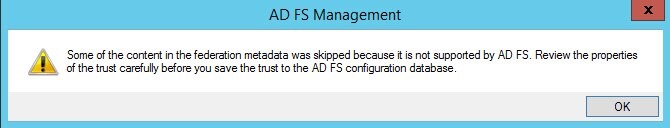如果显示有关 ADFS 中不支持的功能的警告窗口,请单击确定继续(这与 OAM IdP SAML 2.0 元数据中列出的 SAML 属性授权功能相关)。