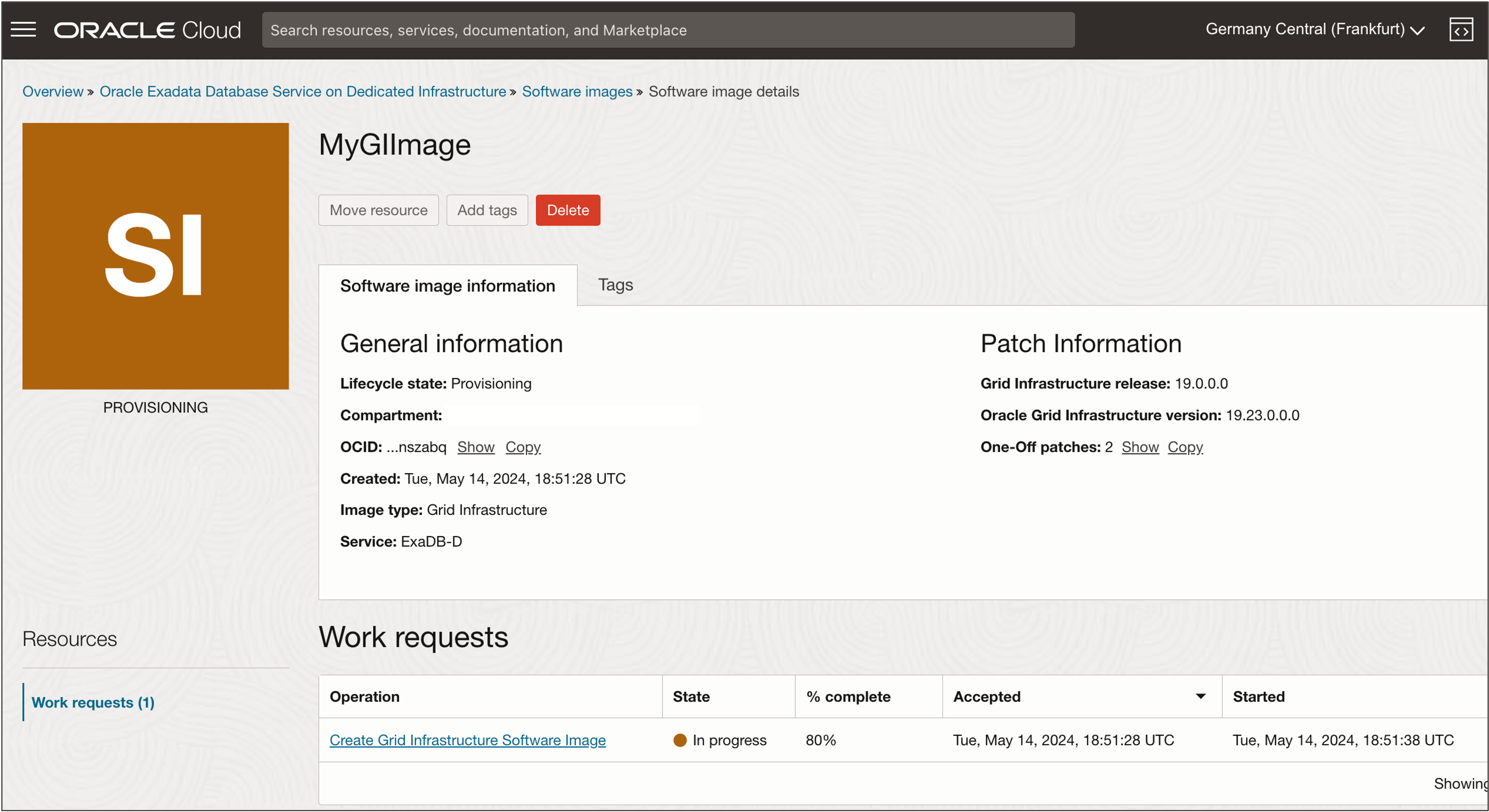 系統會使用選取的 Oracle Grid Infrastructure 版本和指定的單次修正程式建立自訂 Oracle Grid Infrastructure 軟體映像檔。在軟體映像檔詳細資訊頁面中,按一下顯示以檢視軟體映像檔中所含的單次修正程式清單。單次修正程式清單會顯示 Oracle 提供的所有其他單次修正程式 (如果有的話),以及使用者提供的所有單次修正程式 (如果有的話)。