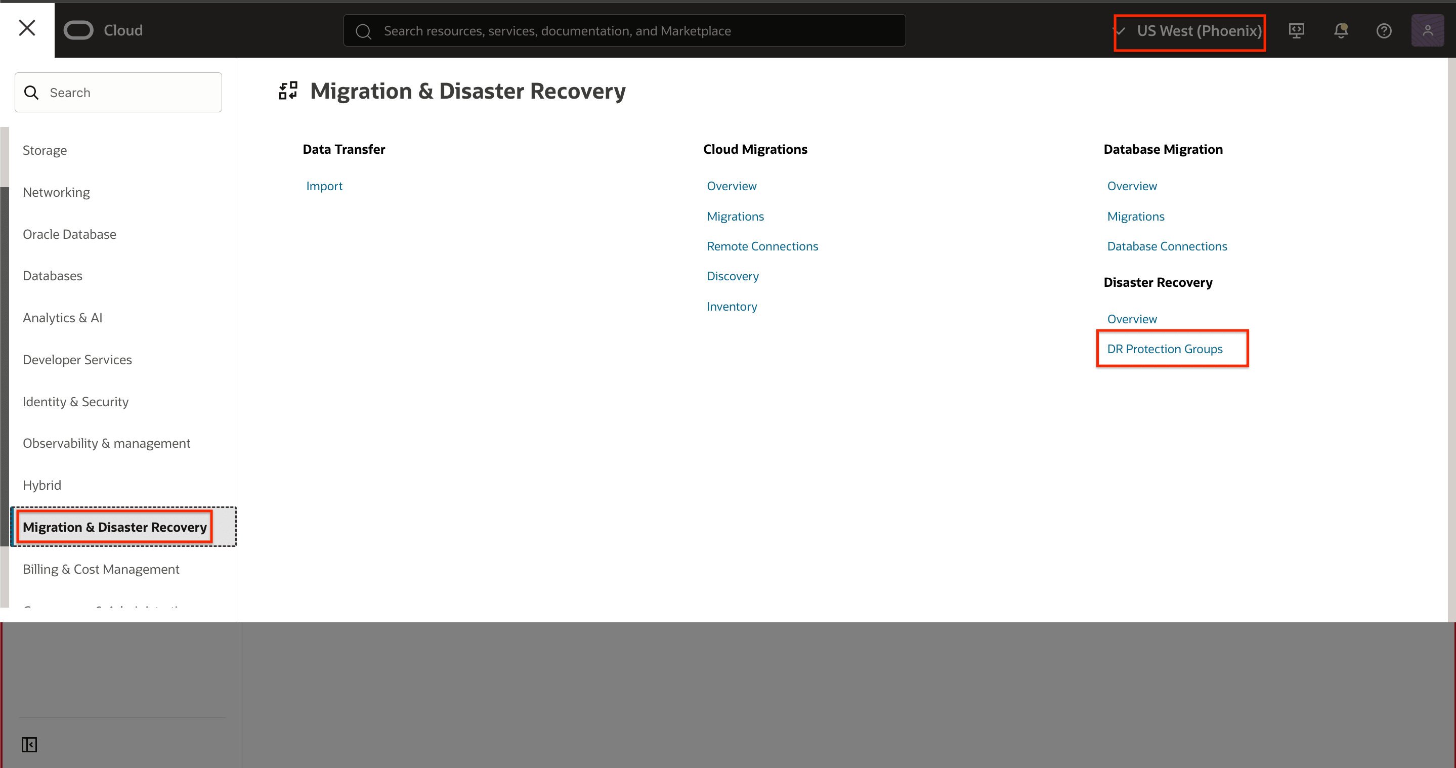 前往 OCI 主控台並瀏覽至 DR 保護群組 (如圖 1.1 所示)。