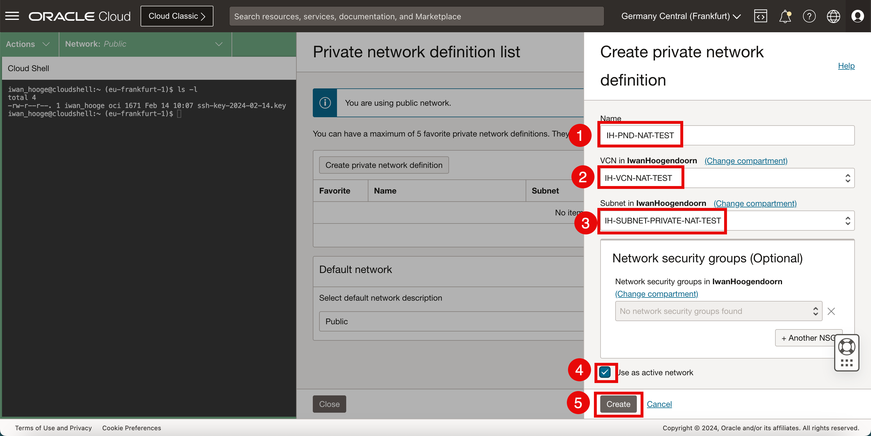 請建立專用網路定義,以便使用 OCI Cloud Shell 登入執行處理。