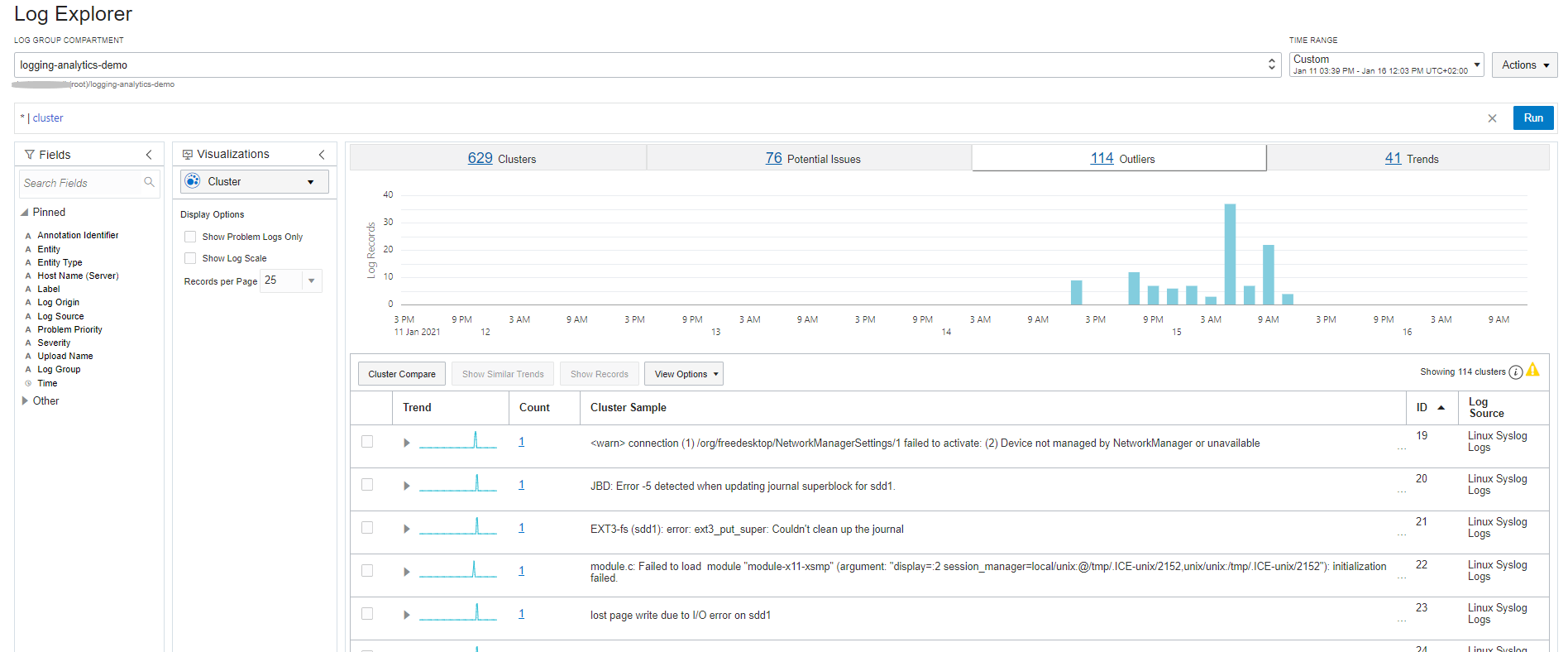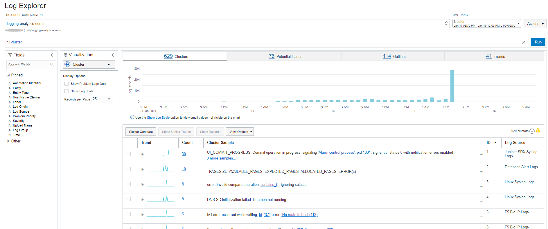 在本教學課程中,瞭解如何使用 Oracle Cloud Infrastructure Logging 分析輕鬆執行這類作業,包括極端偵測、事件叢集、日誌關聯以及異常偵測。