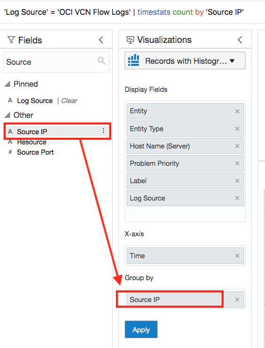 在「欄位面板」的搜尋方塊中,搜尋 」Source「 字串。然後,將「來源 IP」從「其他」拖放至「視覺化面板」的「群組方式」方塊,然後按一下套用。