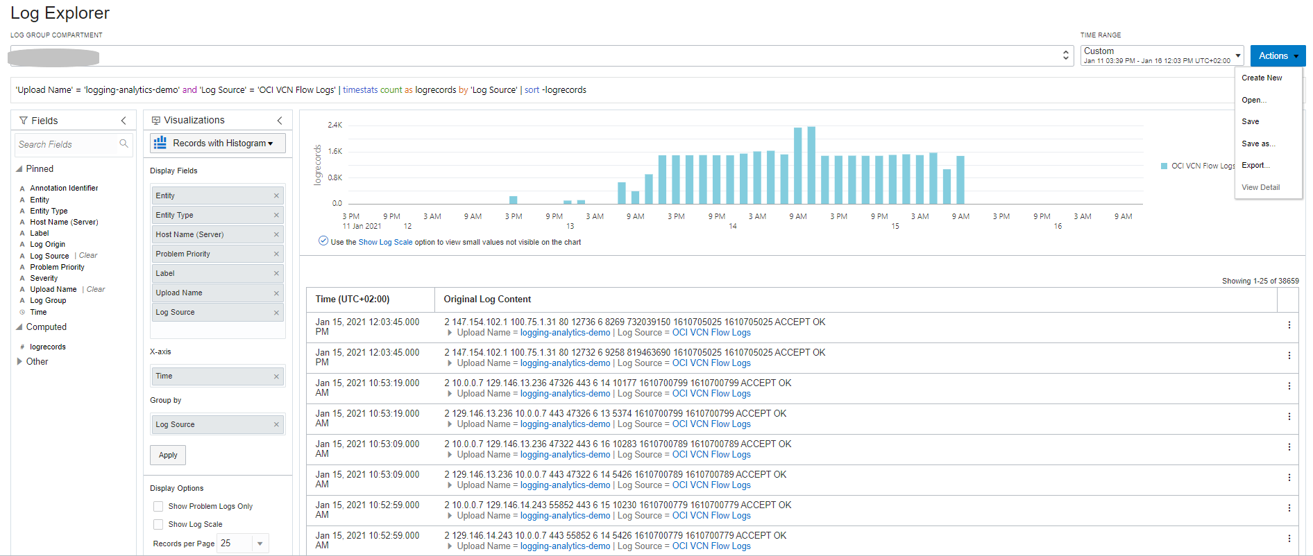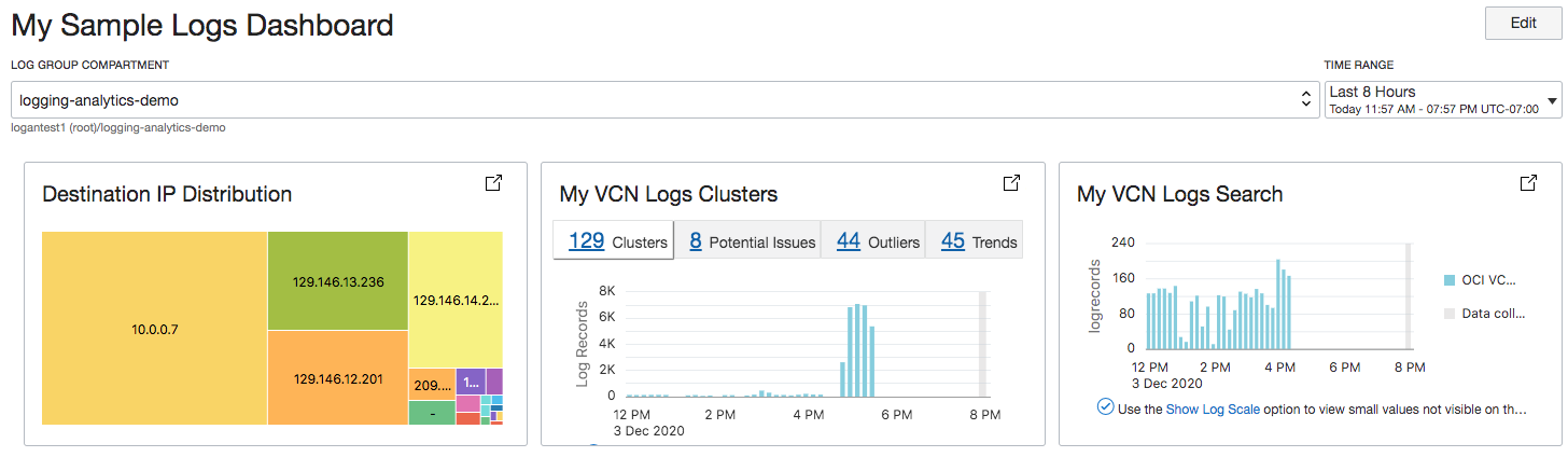 'Log Source' = 'OCI VCN Flow Logs’ | stats count('Destination IP') by 'Destination IP'