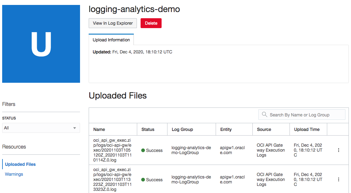 按一下「上傳的檔案」頁面左側功能表中的在日誌總管中檢視。