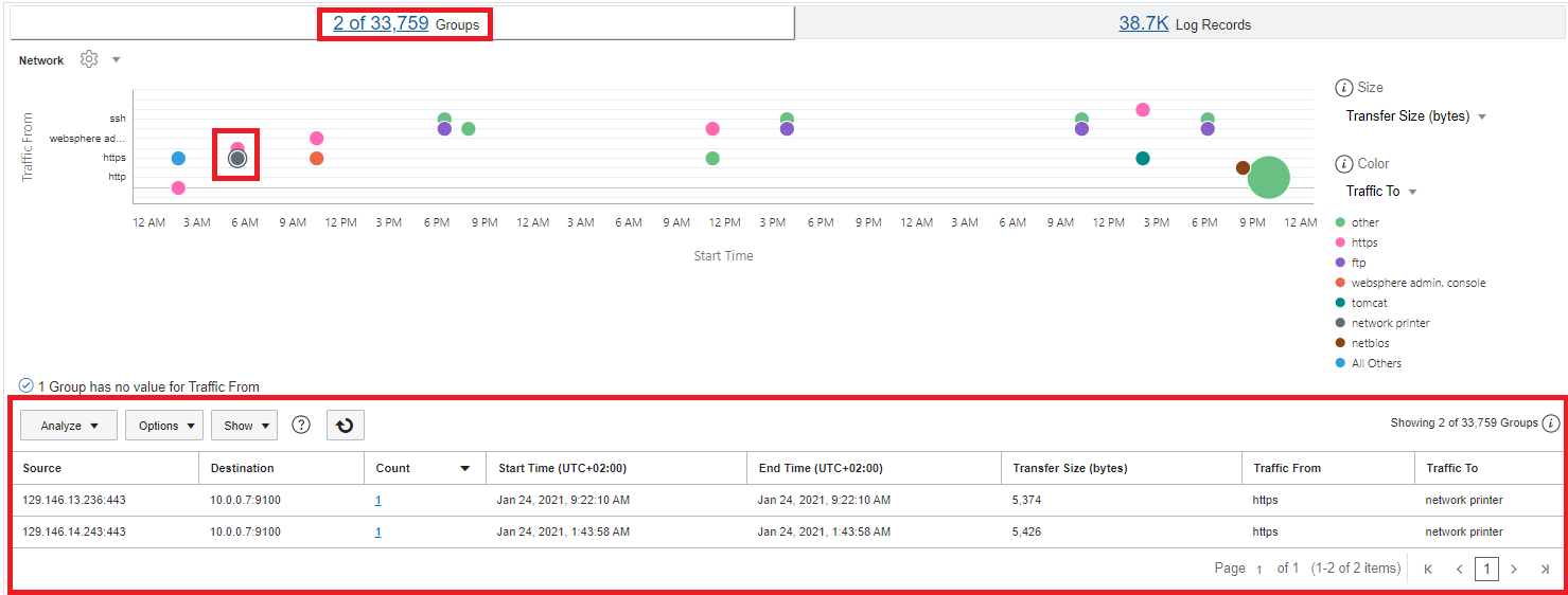 'Upload Name' = 'logging-analytics-demo' and 'Log Source' = 'OCI VCN Flow Logs' | eval 'Source Name' = if('Source Port' = 80, HTTP, 'Source Port' = 443, HTTPS, 'Source Port' = 21, FTP, 'Source Port' = 22, SSH, 'Source Port' = 137, NetBIOS, 'Source Port' = 648, RRP, 'Source Port' = 9006, Tomcat, 'Source Port' = 9042, Cassandra, 'Source Port' = 9060, 'Websphere Admin. Console', 'Source Port' = 9100, 'Network Printer', 'Source Port' = 9200, 'Elastic Search', Other) | eval 'Destination Name' = if('Destination Port' = 80, HTTP, 'Destination Port' = 443, HTTPS, 'Destination Port' = 21, SSH, 'Destination Port' = 22, FTP, 'Destination Port' = 137, NetBIOS, 'Destination Port' = 648, RRP, 'Destination Port' = 9006, Tomcat, 'Destination Port' = 9042, Cassandra, 'Destination Port' = 9060, 'Websphere Admin. Console', 'Destination Port' = 9100, 'Network Printer', 'Destination Port' = 9200, 'Elastic Search', Other) | eval Source = 'Source IP' || ':' || 'Source Port' | eval Destination = 'Destination IP' || ':' || 'Destination Port' | link Source, Destination | stats avg('Content Size Out') as 'Transfer Size (bytes)', unique('Source Name') as 'Traffic From', unique('Destination Name') as 'Traffic To' | classify topcount = 300 correlate = -*, Source, Destination 'Start Time', 'Traffic From', 'Transfer Size (bytes)', 'Traffic To' as Networkeval 功能會將連接埠名稱翻譯成應用程式。