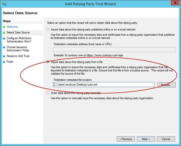 按一下瀏覽並從本機機器選取 OAM SP SAML 2.0 描述資料檔案 (OAM 端點必須終止 SSL),否則 ADFS 將不會匯入描述資料。請參閱 SSL 的必要條件文章。
